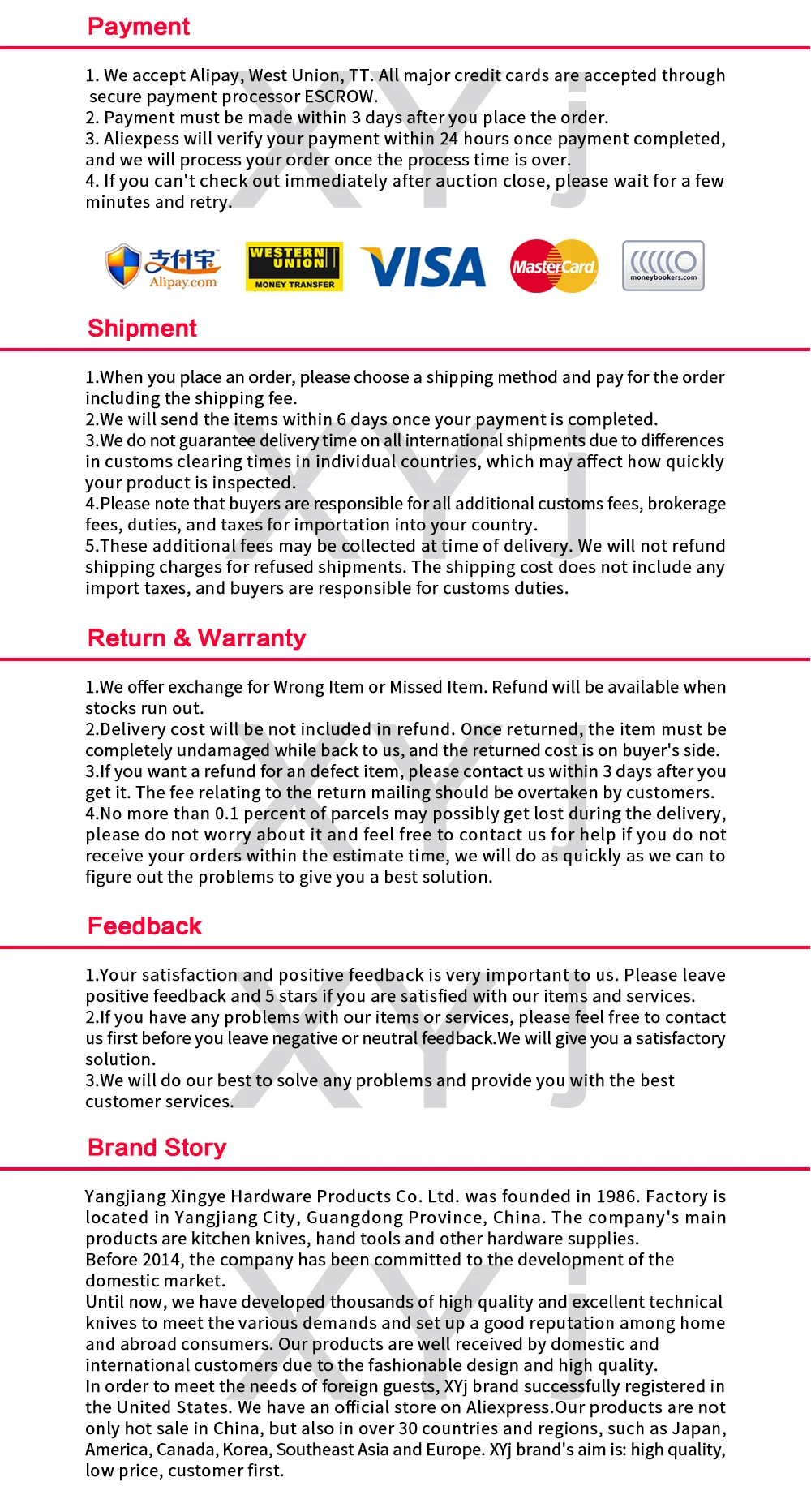 Название: XYj полностью Тан ручной работы кованый нож шеф-повара Длина лезвия: 16,5 см Ширина лезвия: 10,5 см (в самом широком месте) Толщина лезвия: 5 мм Вес нетто: 440 г Материал: Кованая Высокоуглеродистая сталь ручной работы. Ручка: Полностью интегрированная стальная ручка с заклепками G10 Характеристики: бритва острая для легкой резки бумаги Ножевая оболочка специальная конструкция: маленький карман, который может держать точильный камень Внимание: Ножи заточены вручную работниками с более, чем 30-летним опытом работы с помощью натуральных нож шлифовальные добываемых из Mount Emei. По сравнению с кухонными ножами, изготовленными механическими способами, срок службы таких ножей больше. Из-за закалки навыков, сделанных опытными работниками и уникальной технологии формирования с различными методами нагрева, равновесие между жесткостью и прочностью таких ножей является гарантией, чтобы сделать их более прочными. Кованые ножи имеют более высокое содержание углерода. Внимание следует обратить на очистку, кислотные или щелочные вещества, которые не могут оставаться На лезвиях в течение длительного периода времени. Такой нож должен быть вытерт сухой после очистки. Некоторые кулинарные масла могут быть применены на нем, если он не используется в течение длительного времени. И он должен быть помещен в сухом месте для хранения. Посылка включает в себя: 1 * Нож для мясника 1 * ножевая оболочка (маленький карман, который может держать точильный камень) 1 * точилка для ножей