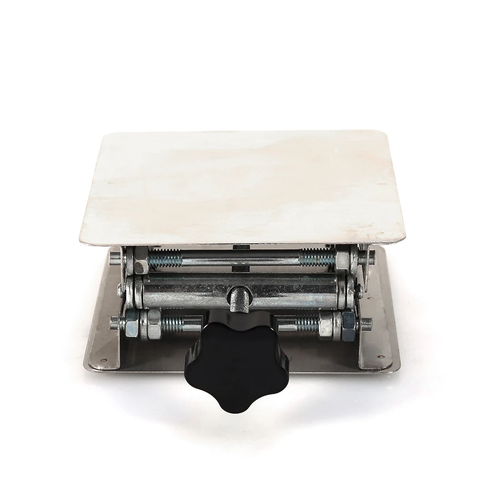 Материал: нержавеющая сталь Размеры: столешница 100x100 мм, максимальная 150 мм, самая низкая 45 мм. Конструкция: экспериментальный подъем панелью, под полом и вращающимся валом, маховиком и другими компонентами. Назначение: подъем для регулирования положения объекта по высоте опорный аппарат. Для физических, химических, биологических экспериментов поднимают объект или инструмент.