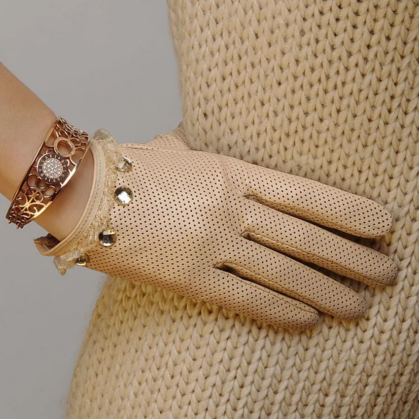 Перчатки из натуральной кожи женские Демисезонный тонкие подкладки для вождения из натуральной кожи, женские ботинки из овечьей кожи; Перчатки Кружева наручные L006N-1