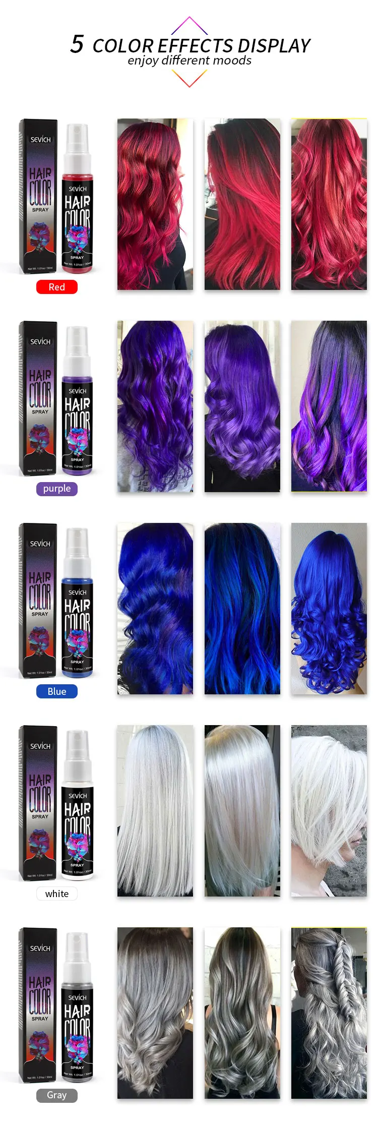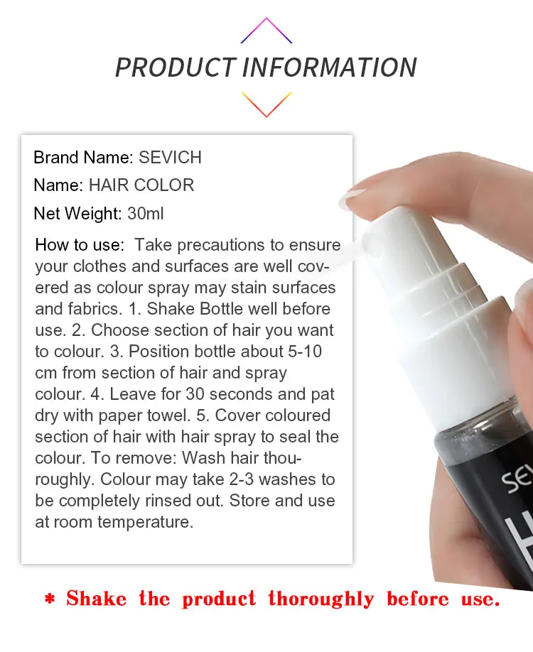 1. Цвет: 5 цветов, красный, синий, фиолетовый, белый, серый2. Вес нетто: 30 мл.3. Распылительная краска для волос с уникальным аппликатором, который позволяет вам просто чистить цвет, где вы хотите, чтобы он появился!4. Краска без перчаток-мягко окрашивает цвет после распыления.5. Моется и легко чистится.6. Временная Краска для волос отлично подходит для тех, кто любит демонстрировать свою индивидуальность без стоимости дорогих салонов.