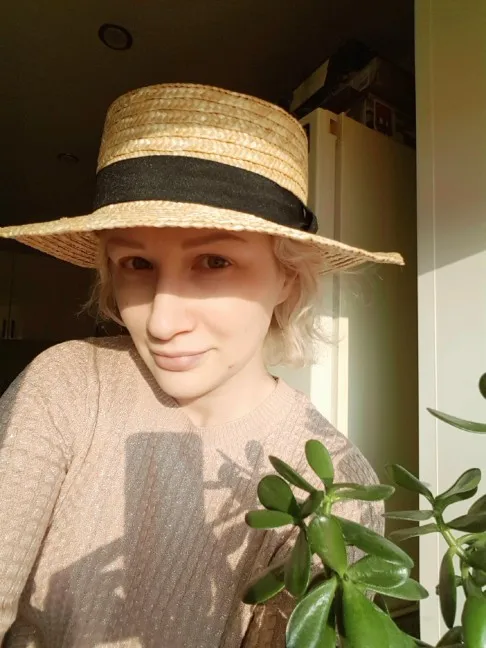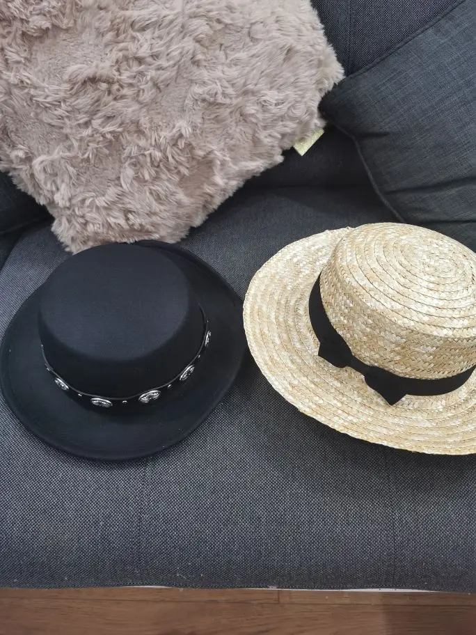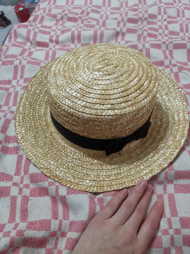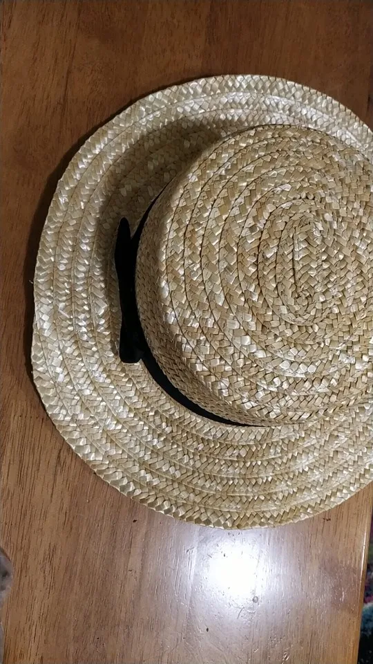 Шляпа хорошая,натуральная,пришла со слегка помятыми полями,которые легко выровнялись,тулья не пострадала.Слелана аккуратно,но не пойму,почему так несуразно на мне сидит?)).Примеряла такие шляпки канотье не раз и мне очень шло,а это как-то не то...яНа голову 58 тесновато и у меня пышные волосы,подскакивает с головы.В целом,не однозначная радость,а так пойдет,да за такую цену!)).
