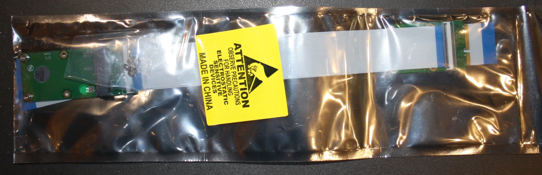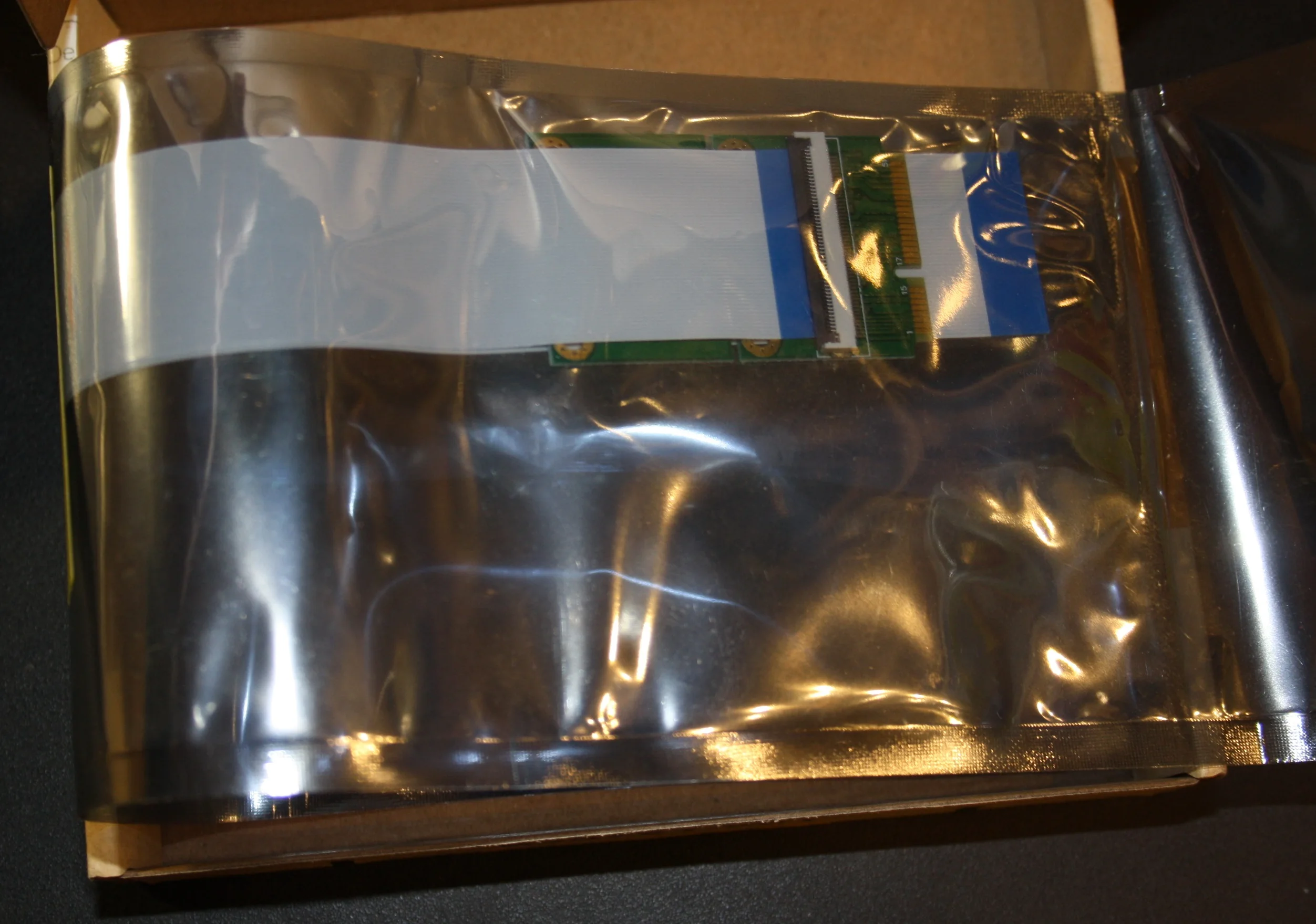 Отправка на второй день после оплаты. Доставка до пункта выдачи DPD в городе северо-западного региона РФ заняла 19 дней. Упаковка -- картонная коробка, сами платки и шлейфы упакованы в запаянные антистатический пакет (на фото). Стойки для mini PCI-E припаяны на плату на размер fullsize (как на фото в описании) -- для подключения плат размера halfsize нужно либо перепаивать стойки, либо искать другие. Проверил -- работает. Субъективно комплект кажется дороговатым, но более дешевых аналогов не нашел.