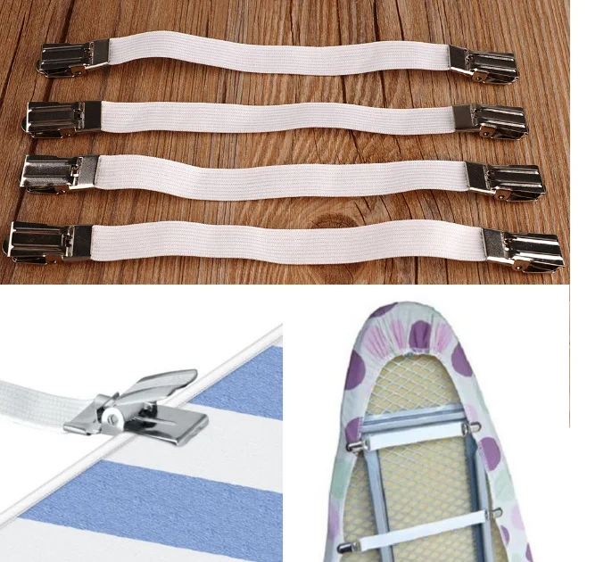 100% новый и высококачественный Материал: безэлектродная никелированная сталь Стиль: зажимы для простыней. Материал: Железный зажим + нейлоновая эластичная нить Цвет: белый или черный Размер: 20 см-35 см (регулируемый) Посылка 4 шт х Зажимы для простыней