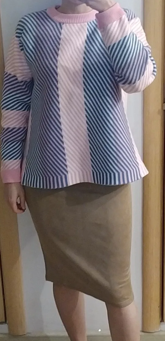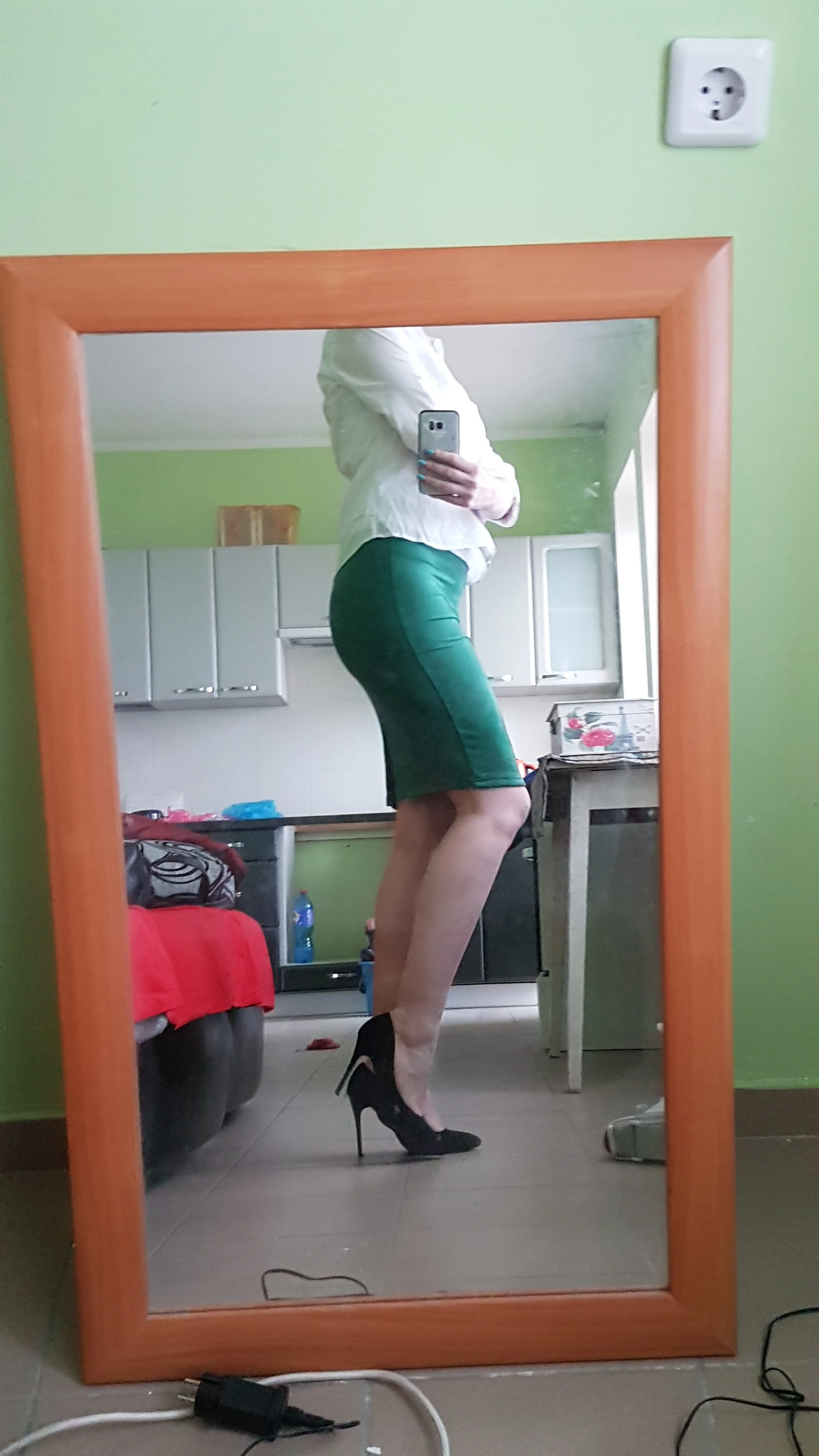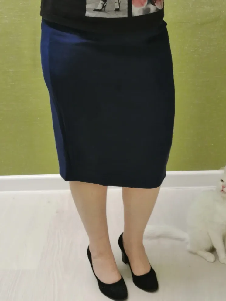 Ткань просто невероятно приятная. Хотела заметить некоторые косяки, но как только прикасаюсь к юбке, все косяки забываются)) Немного ошиблась с размером, поэтому она для меня коротковата (приходится надевать не до пояса, а чуть ниже, и обтягивает меня сильнее, чем должна). Юбка отлично тянется. сверху на ткани непонятные полоски, но мне не понравилось, как выглядит заправленная под юбку одежда, поэтому полоски при ношении будут закрываться блузами.