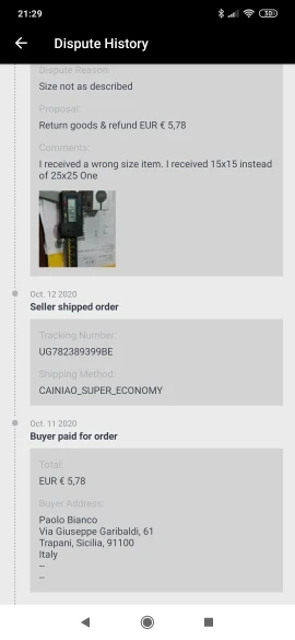 Получили неправильные замеры. Возвращен с TNT .. AliExpress принимает решение не возвращать деньги, так как TNT задержала доставку, превосходя 15 г. Невозможно открыть новый спор. Я все еще жду возмещения продавцом.
