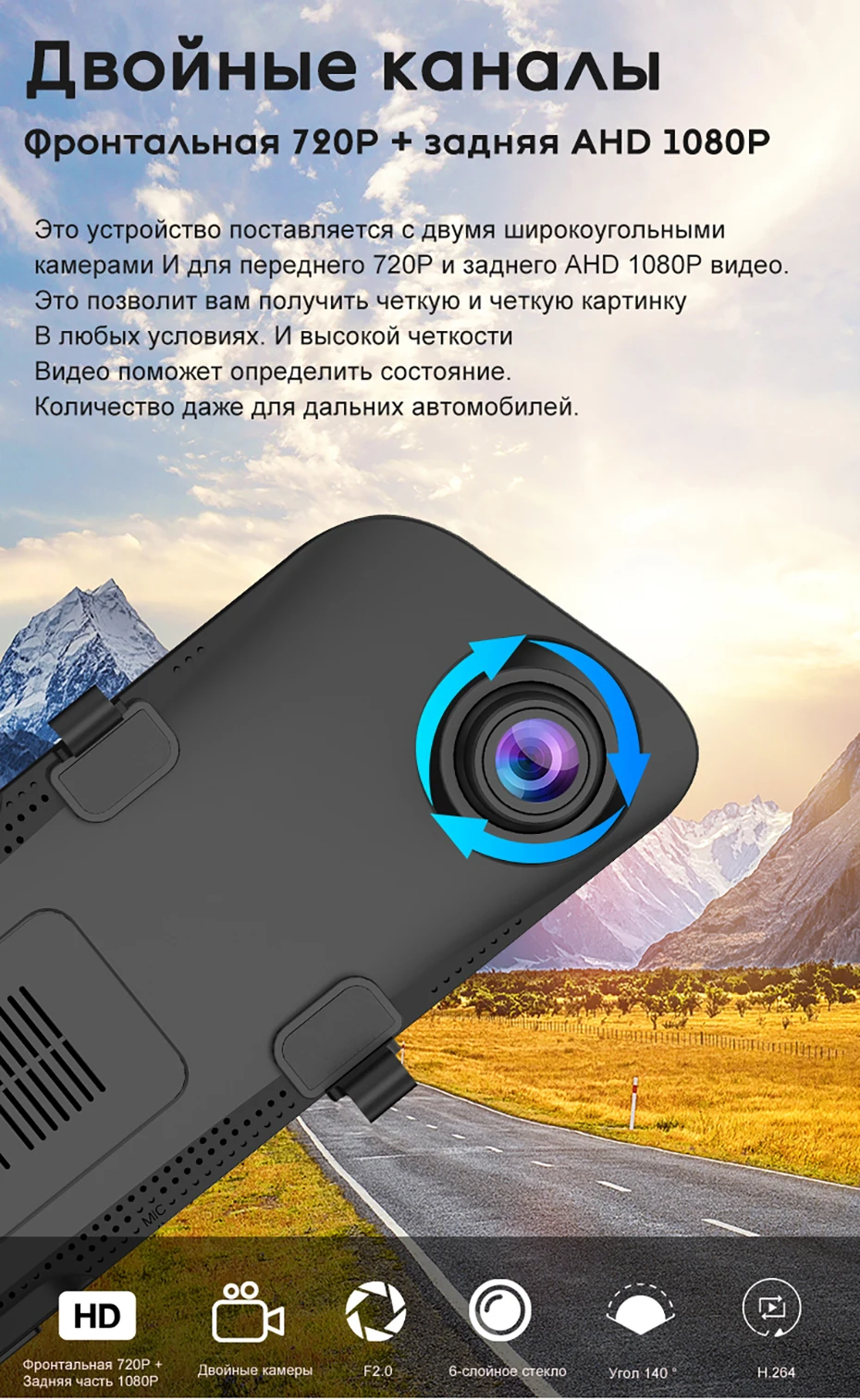 Этот автомобильный видеорегистратор имеет две камеры, которые позволяют одновременно записывать видео с двух разных углов. Фронтальная камера: 1080P... Задний Камера: VGA Авто парковки задним ходом