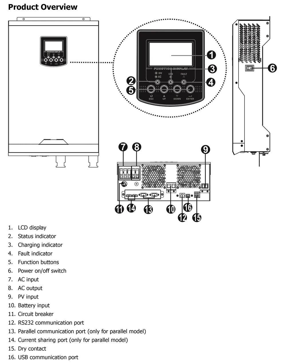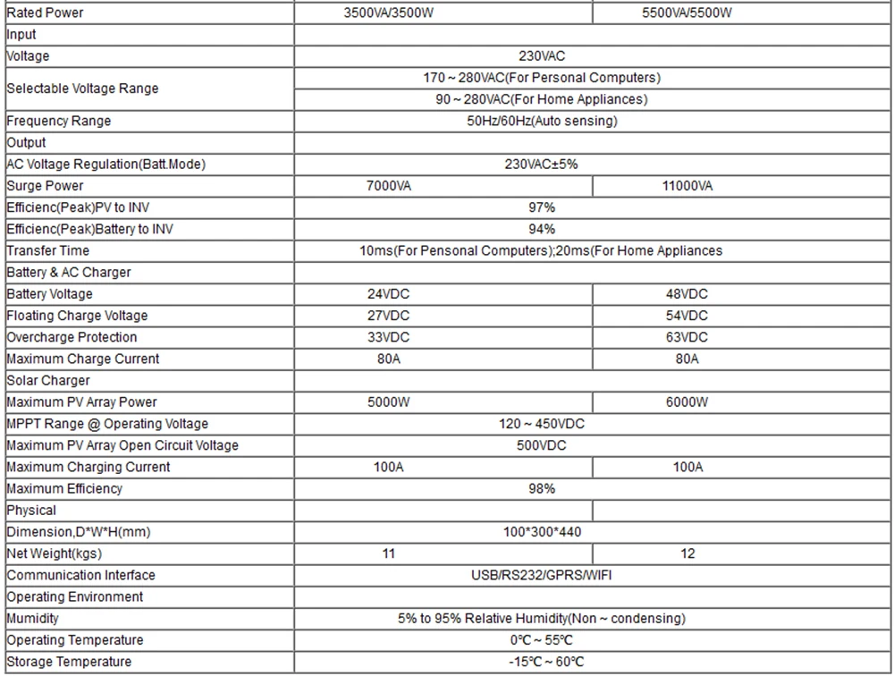 Макс. 6000 Вт MPPT солнечные панели для 5500 ВтСолнечное зарядное устройство с максимальным зарядным током 100A120-500 в широкий PV входЛитиевая батарея, свинцово-кислотная батарея, гелевая батареяНе может работать без аккумулятораГенерирует энергию от PV непосредственно для подачи нагрузки, даже без батареиЭффективность PV до AC намного выше