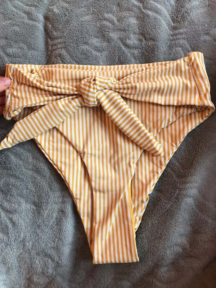 Я не был впечатлен этим бикини. Сначала у него был странный запах. Во-вторых, нижняя часть была мешковатой и не имеет второго слоя на задней стороне. Верх хорошо сидит, мои ремешки были скручены с обеих сторон, и у них было немного пятен. Все еще ноская вещь, но я думал, что буду становиться лучше бикини