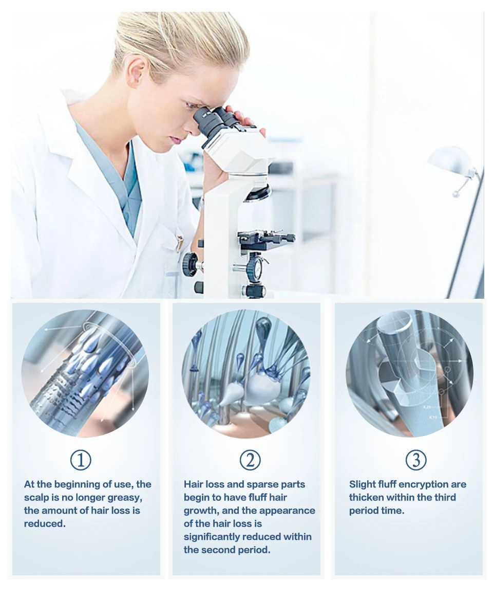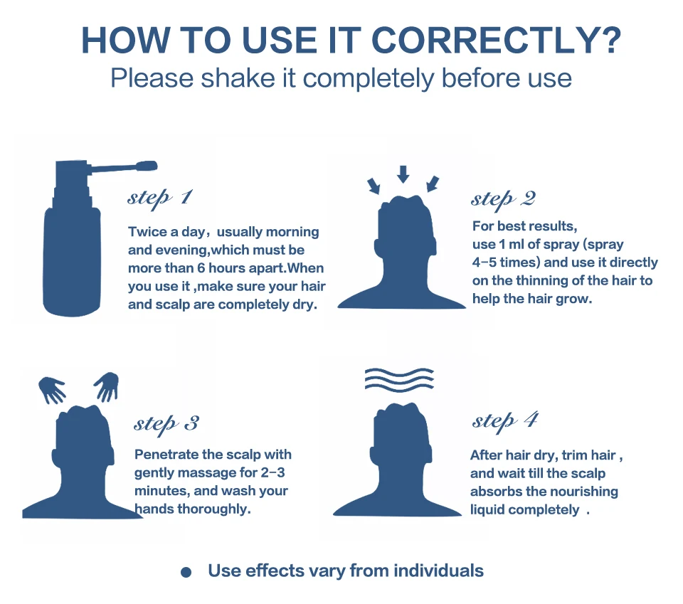Диапазон использования: кожа головы с корнями волос Содержание нетто: 60 мл/бутылка Эффективность продукта: улучшает мягкость волос, избавляет их от выпадения и помогает росту челки на лбу. Основные эффекты: Увеличение и утолщение волос, улучшение состояния волос, предотвращение выпадения волос, стимулирование роста волос, уменьшение лиственных и ломких волос, укрепление и питание корней волос. Как использовать: Шаг 1 Дважды в день, как правило, утром и вечером, с разницей в 6 часов. При использовании убедитесь, что ваши волосы и кожа головы полностью сухие. Шаг 2 Для достижения наилучших результатов используйте 1 мл спрея (распылите 4-5 раз) и используйте непосредственно для истончения волос, чтобы помочь волосам расти. Шаг 3 Аккуратно помассируйте кожу головы в течение 2-3 минут и тщательно Вымойте руки. Шаг 4 После высыхания волос обрежьте волосы и подождите, пока скальп полностью впитает питательную жидкость.