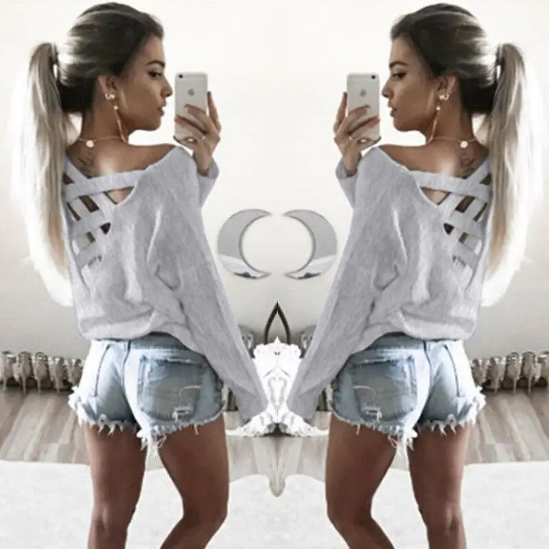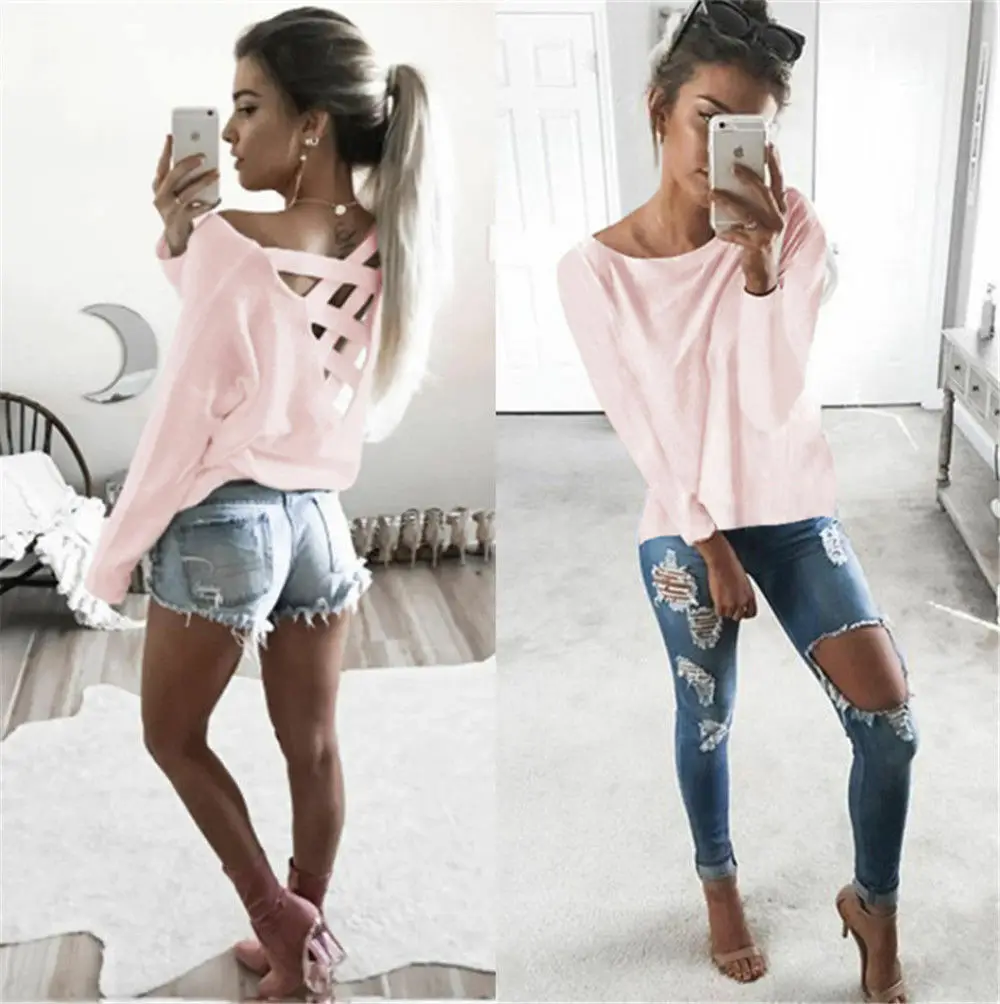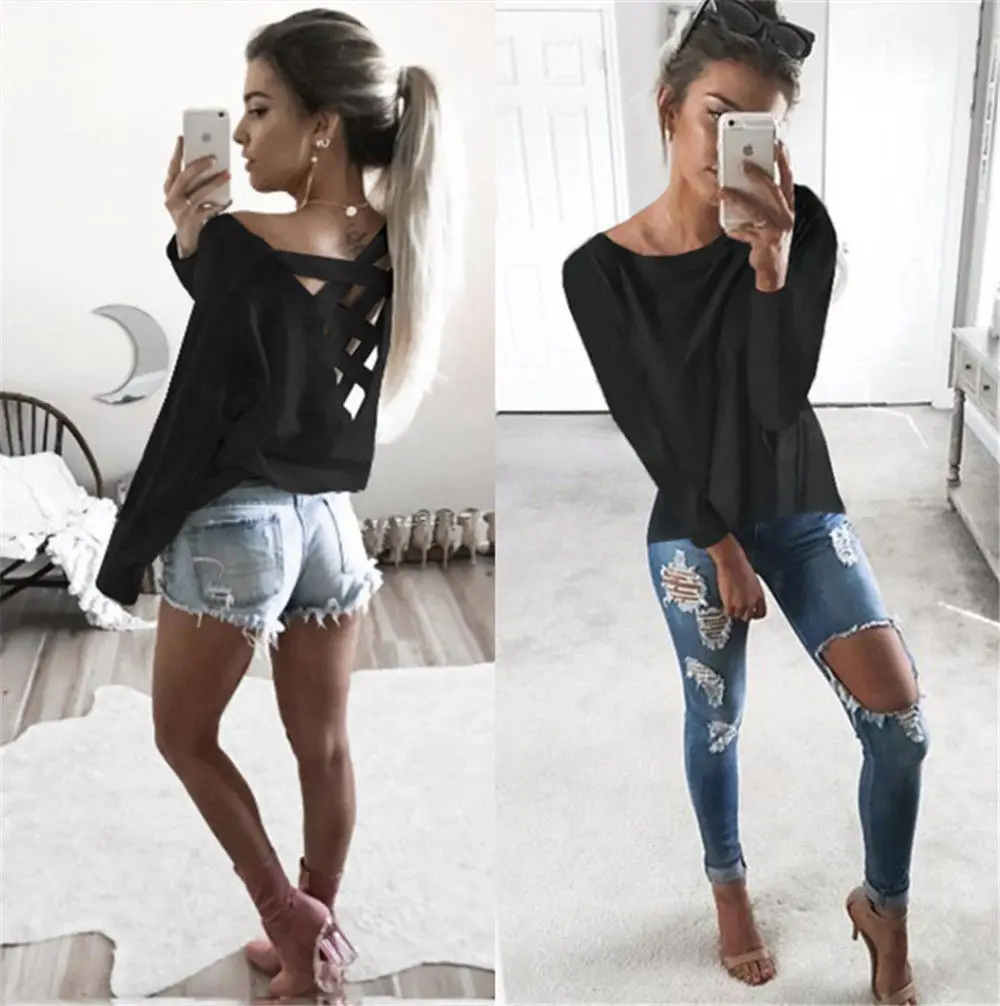 2019 Модные женские футболки с длинным рукавом, сезон осень-зима, сексуальные бандажные рубашки с глубоким V-образным вырезом, женские топы на шнуровке, футболки, одежда