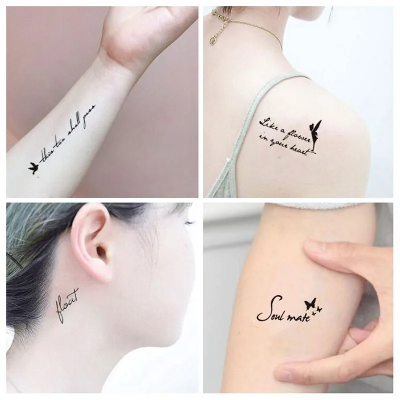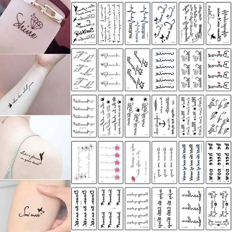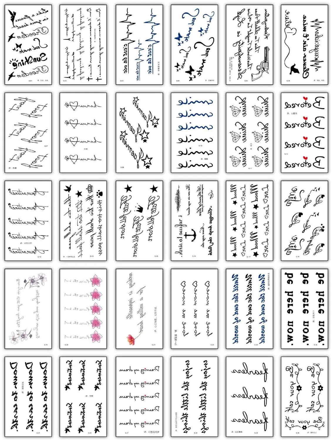 30 шт.лот, буквы, слова, татуировки, текст, маленькие, водонепроницаемые, временные татуировки для девушек, на запястье, шею, тело, тату, черный набор, цветок