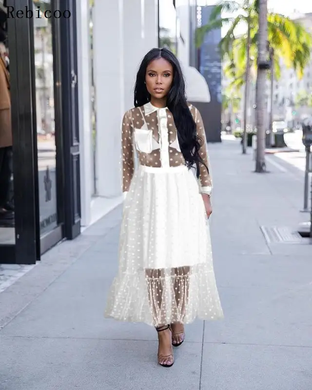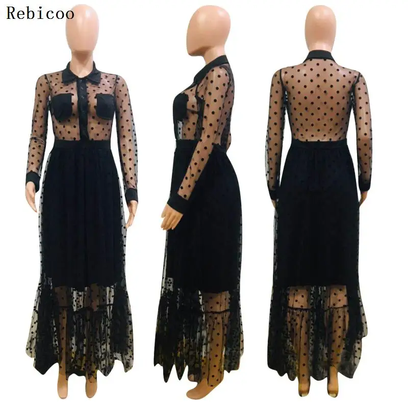 Новое популярное сексуальное женское кружевное платье черное белое в горошек с длинным рукавом осеннее сексуальное длинное платье макси