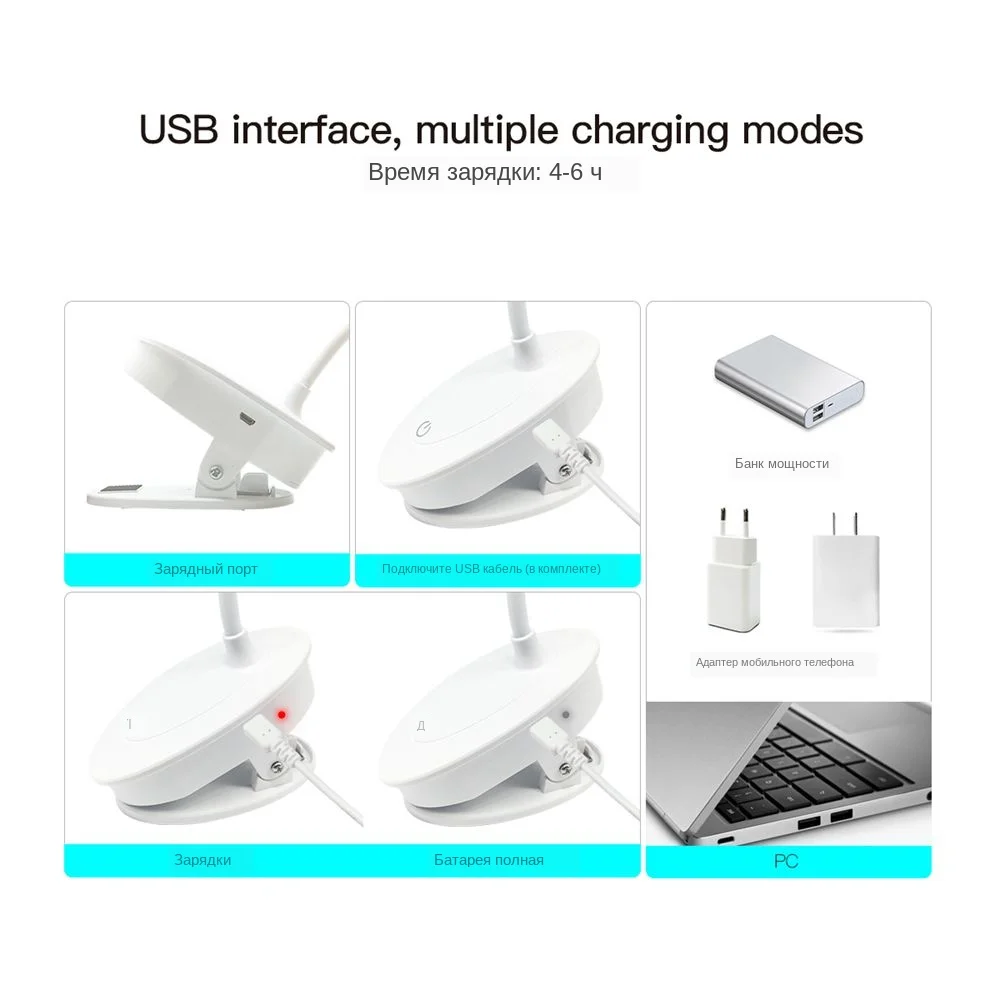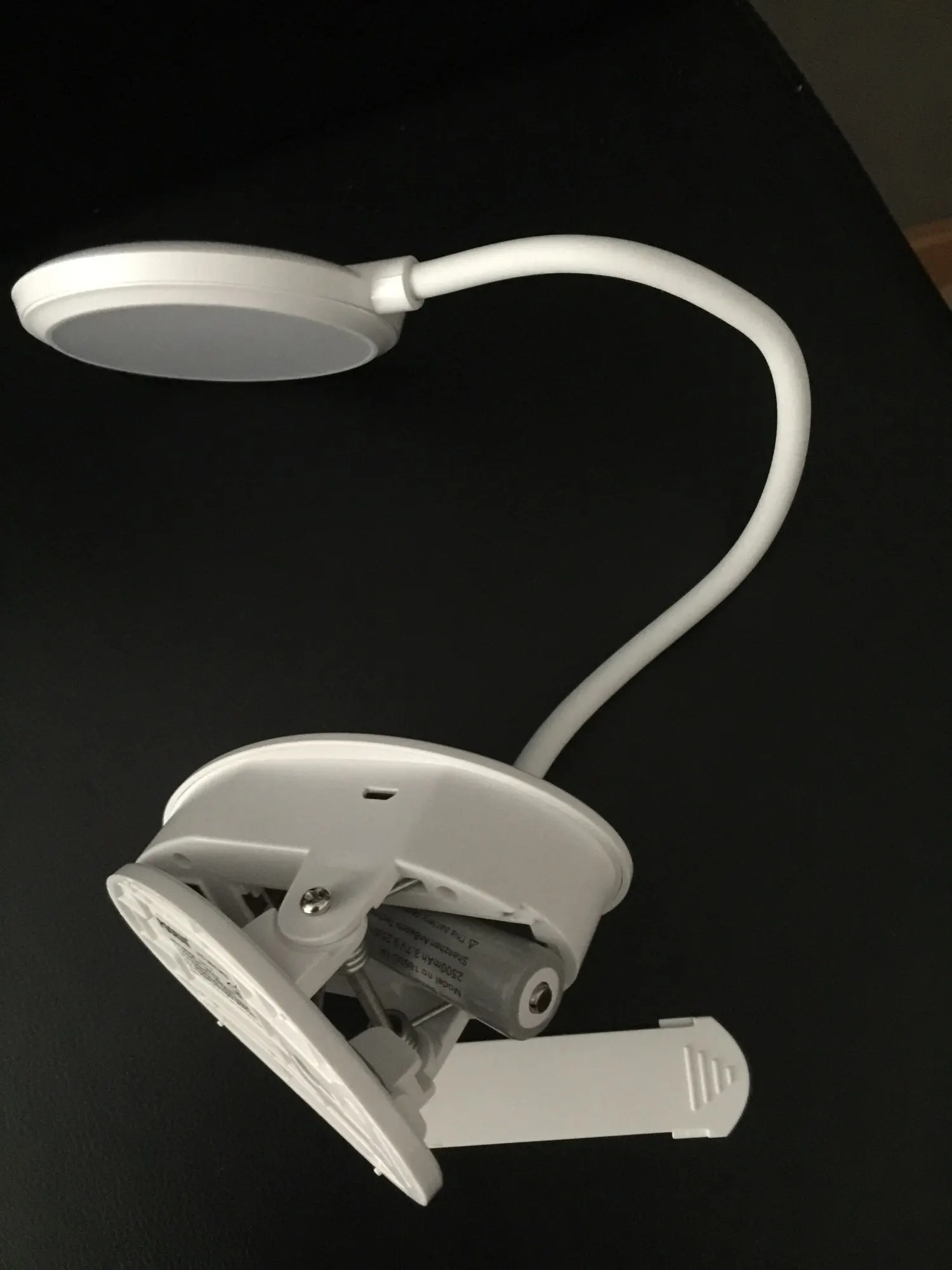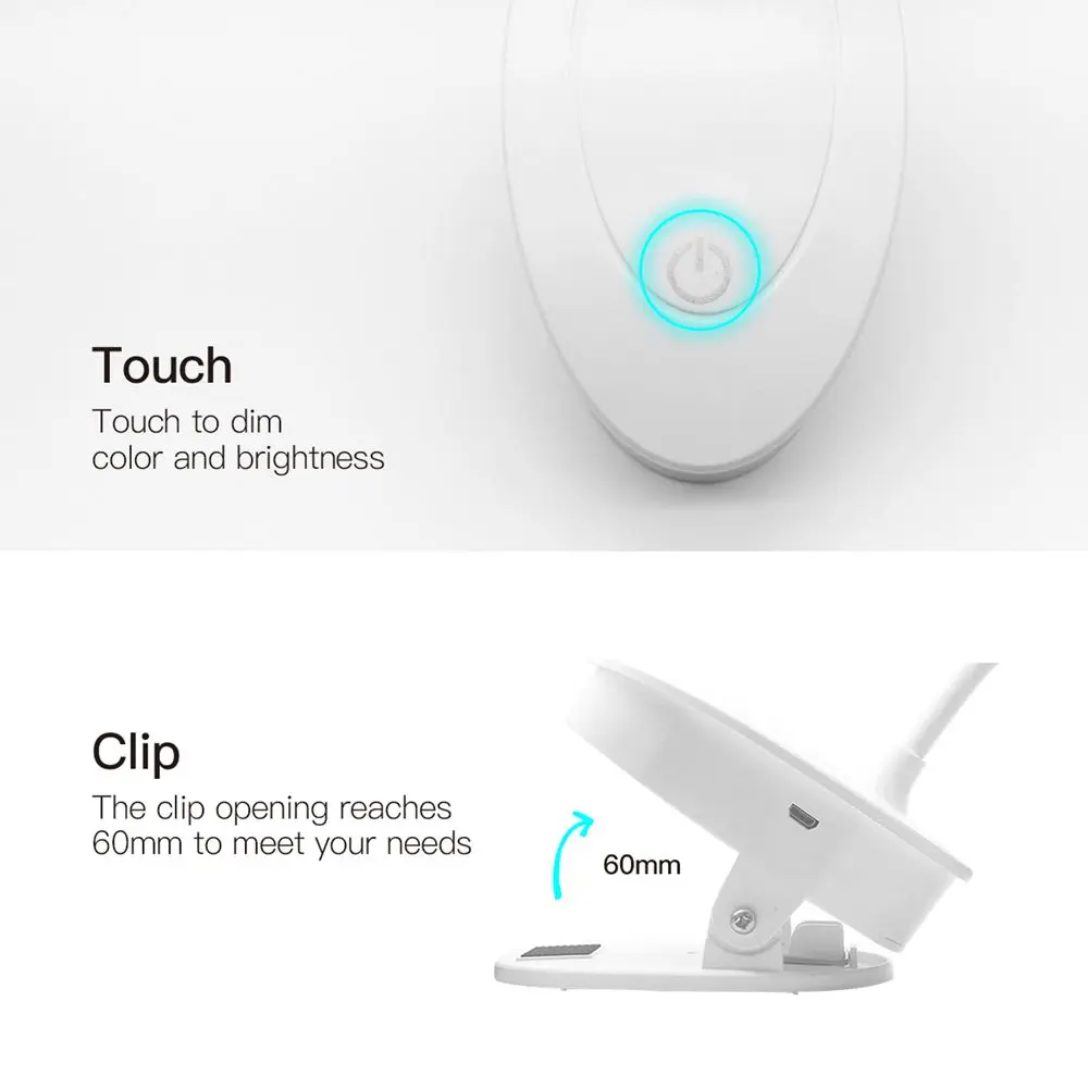 Это здорово! Он имеет 3 интенсивности света с помощью сенсорного выключателя, вы можете выбрать белый свет, теплый свет или сочетание двух. Зажим крепкий и перезаряжаемый аккумулятор с usb-кабелем, хотя он уже поставляется с зарядкой в подарок. Я в восторге, очень рекомендую.