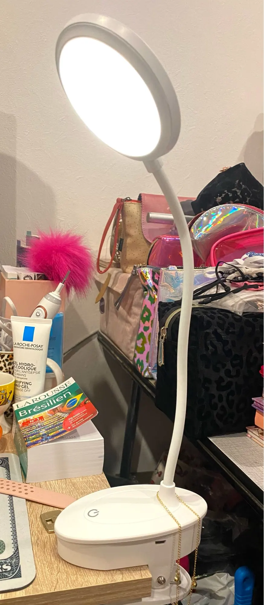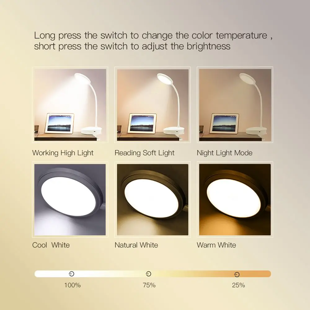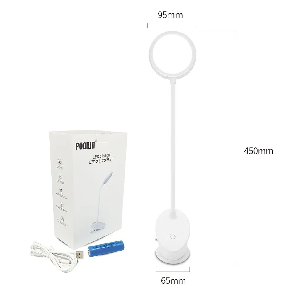 Это здорово! Он имеет 3 интенсивности света с помощью сенсорного выключателя, вы можете выбрать белый свет, теплый свет или сочетание двух. Зажим крепкий и перезаряжаемый аккумулятор с usb-кабелем, хотя он уже поставляется с зарядкой в подарок. Я в восторге, очень рекомендую.
