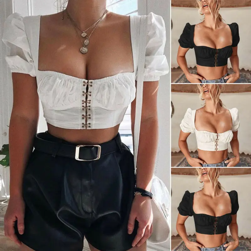 Новый женский сексуальный укороченный топ с квадратным вырезом, футболка с коротким рукавом