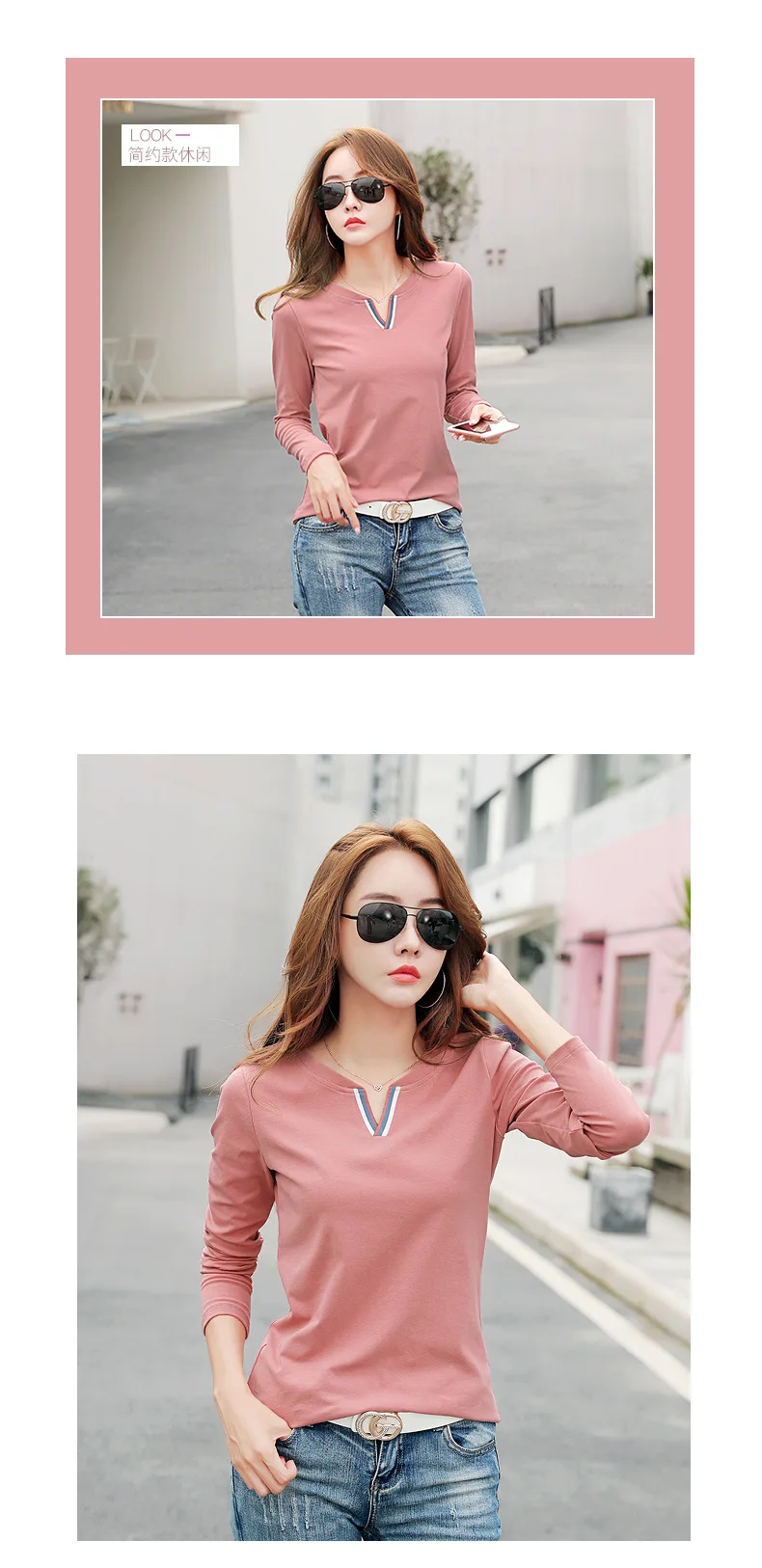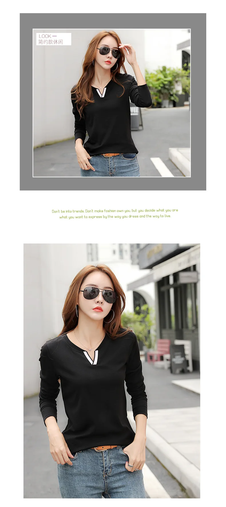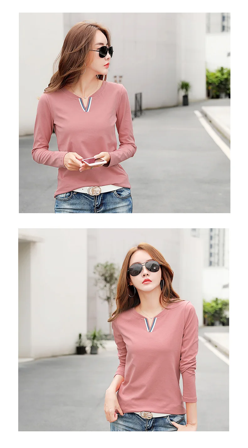 Женская хлопковая Футболка с V-образным вырезом и длинным рукавом