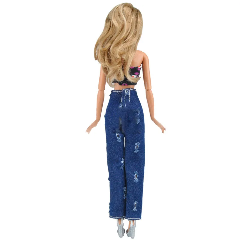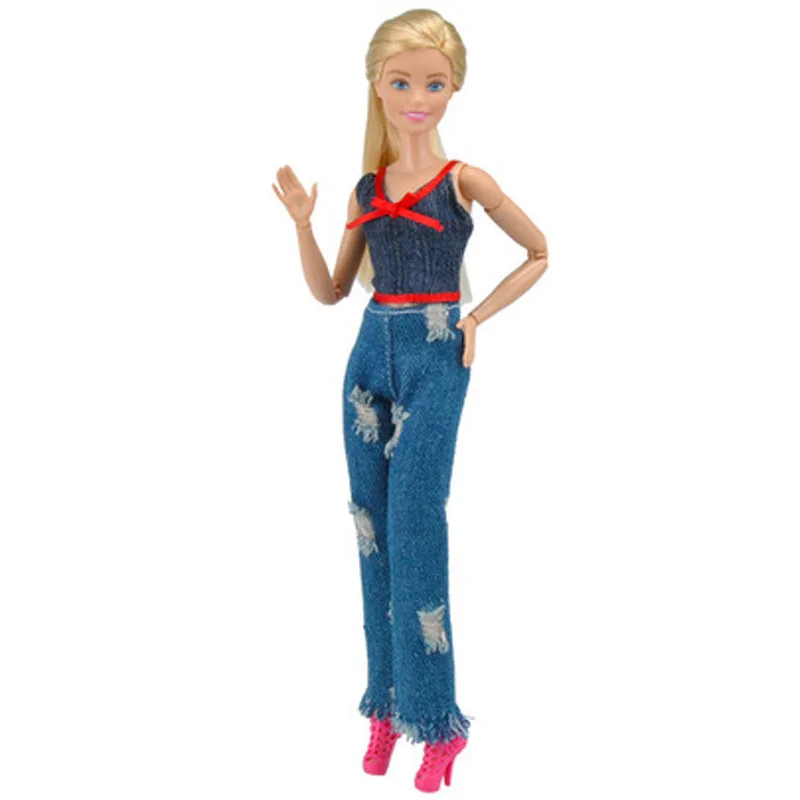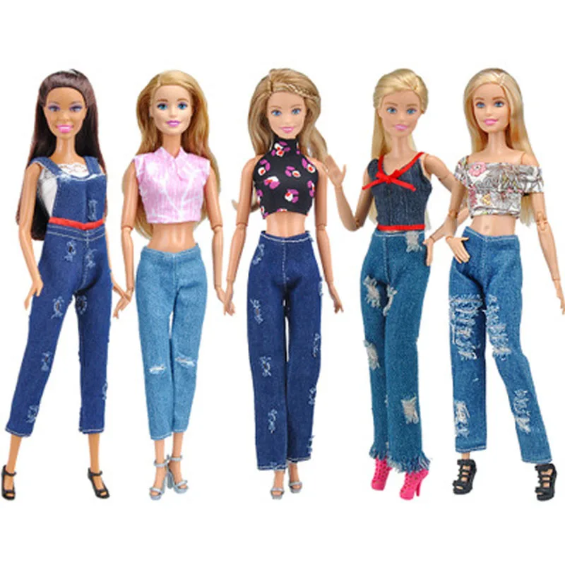 5 комплектов в партии Модная Одежда для куклы Барби футболка с короткими рукавами с изображением героев из мультфильма и джинсы брюки одежда ручной работы для кукольный домик Barbie кукла 16 аксессуары