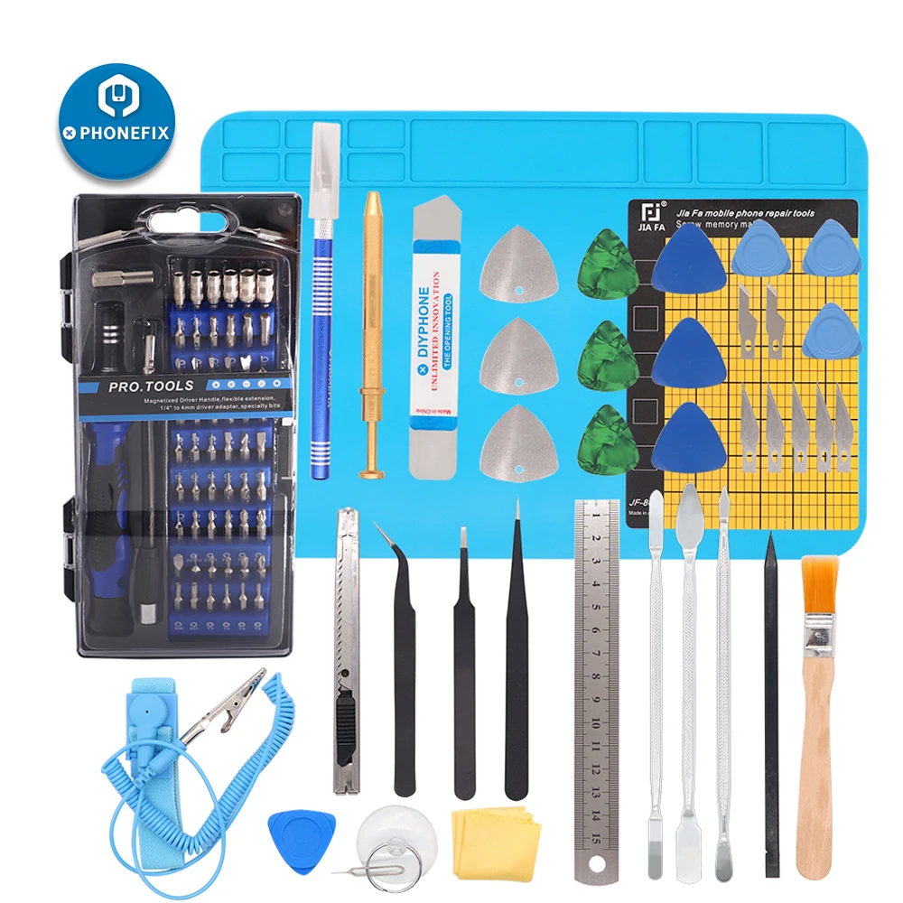 100 в 1 разборный набор ремонтных инструментов:100 в 1 Набор прецизионных отверток включает 56 прецизионных специальных бит, намагниченная ручка водителя,СинийАнтистатический кремний Коврик, антистатический ремешок на запястье, антистатические пинцеты, треугольные пружины, инструмент для удаления ИС, лезвие для DIYPHONE, набор для скраппера и чешуи, инструмент для рычага из стали и присоски с ЖК-дисплеем, треугольный ломтик, ткань для очистки, стальная линейка, инструмент для намагничивания, который может ремонтировать многие электронные устройства и другие инструменты.