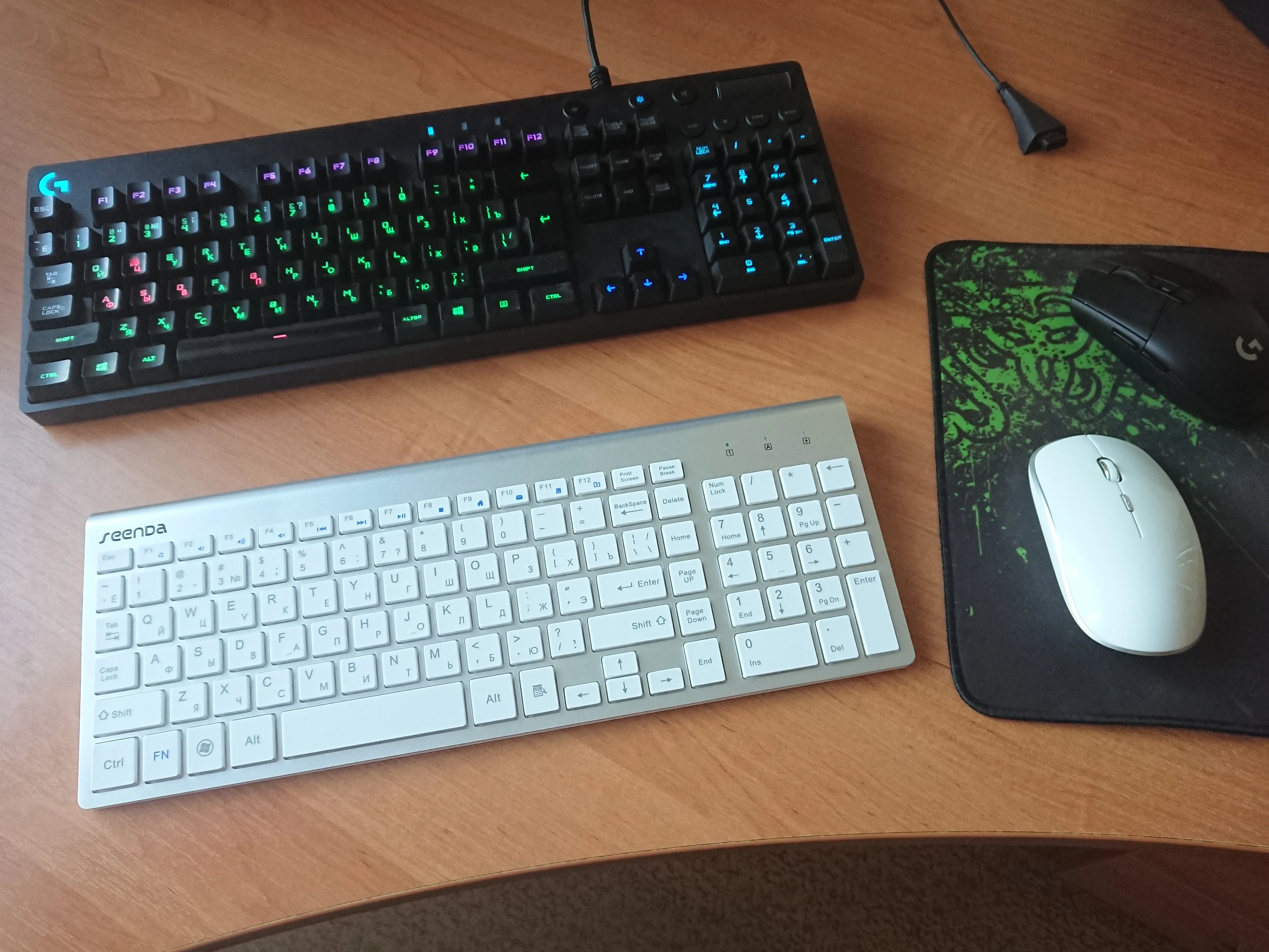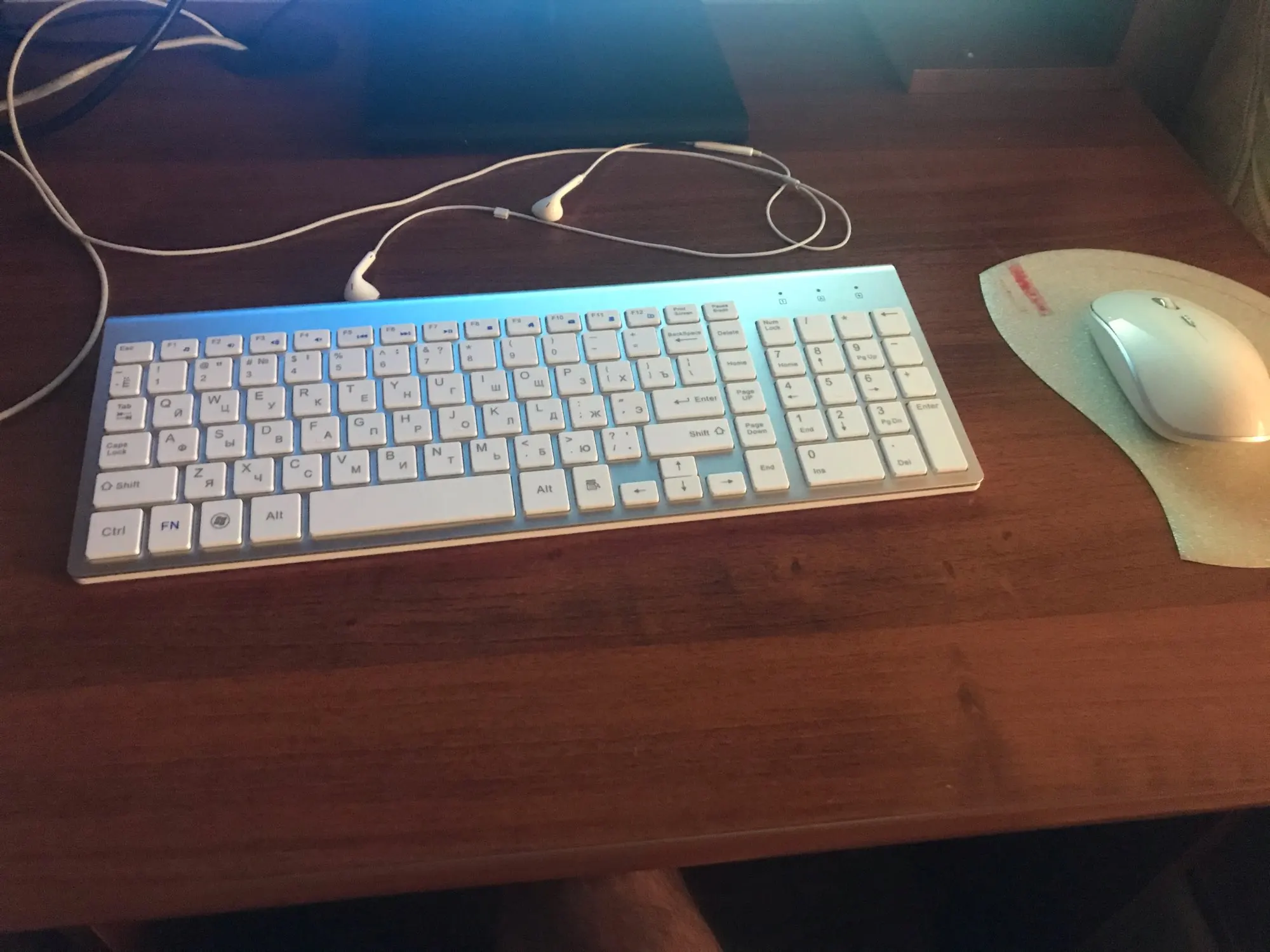 Клавиатура с мышкой вполне качественные. Пластик мыши светопроницаем, когда работает сенсорный светодиод светится вся мышка, в темноте её видно даже в режиме ожидания. Русские быквы видны отлично.