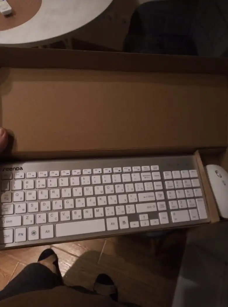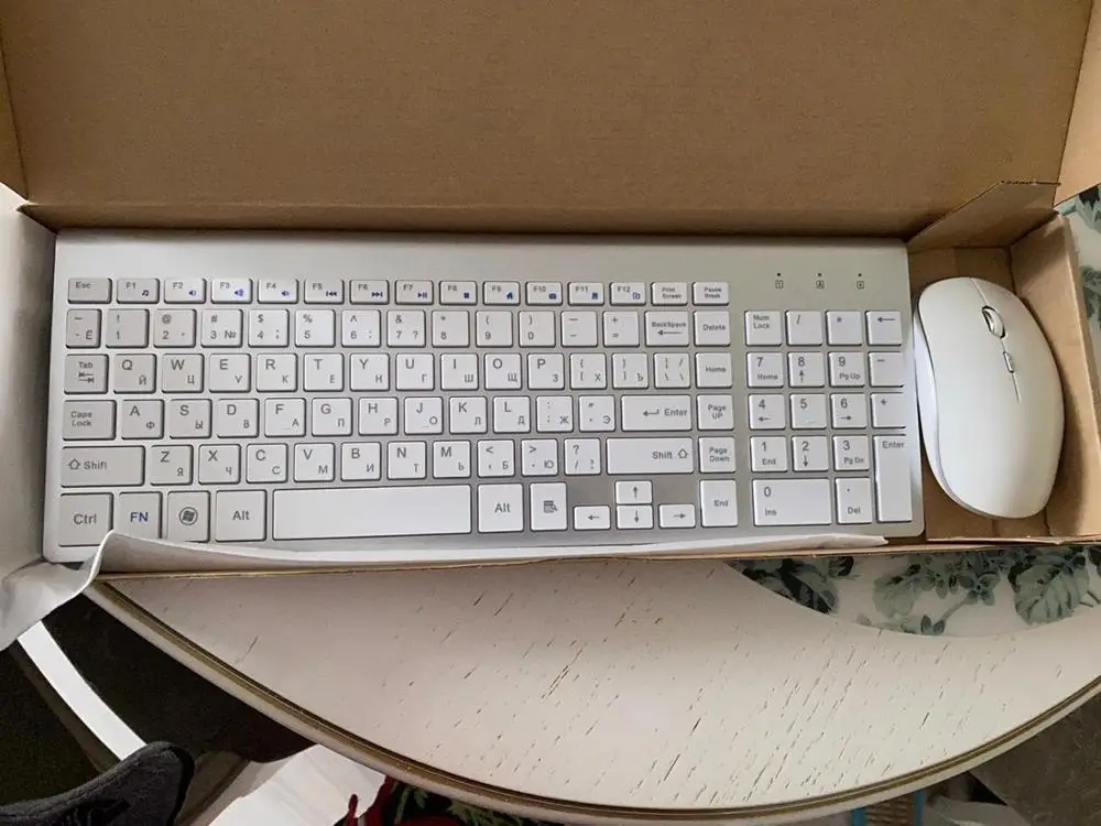 Мне понравилась клавиатура, мышка тихая, клавиши мягкие. Сама клавиатура достаточно тяжелая. Упвковано в картонную коробку. Чубчик USB был в клавиатуре, там где батарейки. Продавец быстро отправил клавиатуру.