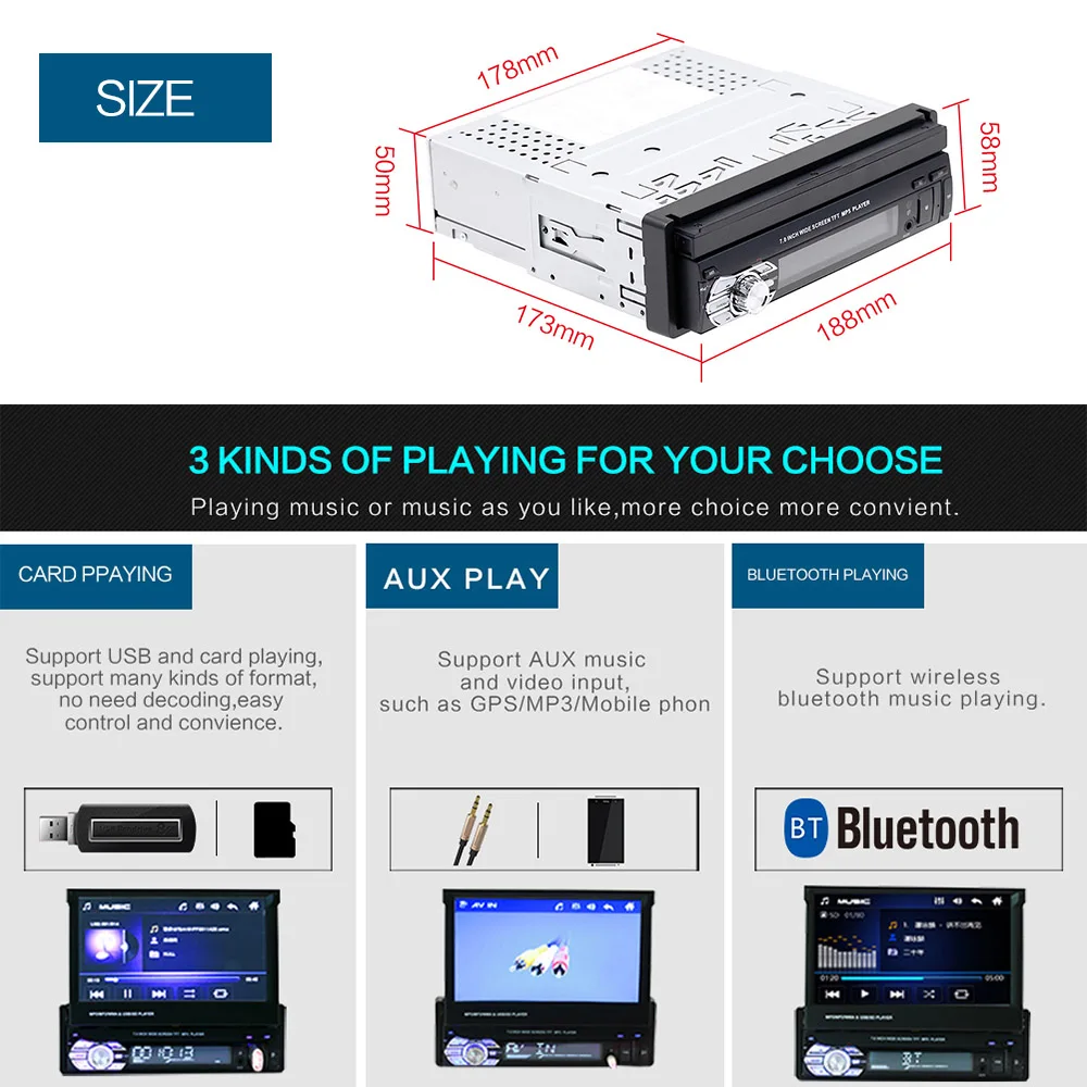 1. 7-inch high definition touch screen, dynamic menu interface. 2. Support SD card, high-speed USB2.0 interface is compatible with a variety of U disk, removable hard drive, hot-swappable. 3. Card-type full-function remote control. 4. Loudness switch, Loud bass reverberation aggravated extraordinary! 5. Hardware electronic sounds (EQ) processing, multiple EQ modes, treble and bass can be adjusted; 6. Full digital electronic control search radio stations, high-performance digital tuning FM radio automatically scans, 18 stations memory 7. Song memory function:Your MP3 player doesn't restart the first song when the power fails. 8. Support shuffle, repeat all, repeat single, repeat directory. 9. AUX audio input interface can add MP3, mobile phones, music players and other audio input. 10. USB support large current output, can charge for mobile phone (Note: Some phones may not charge, please know);