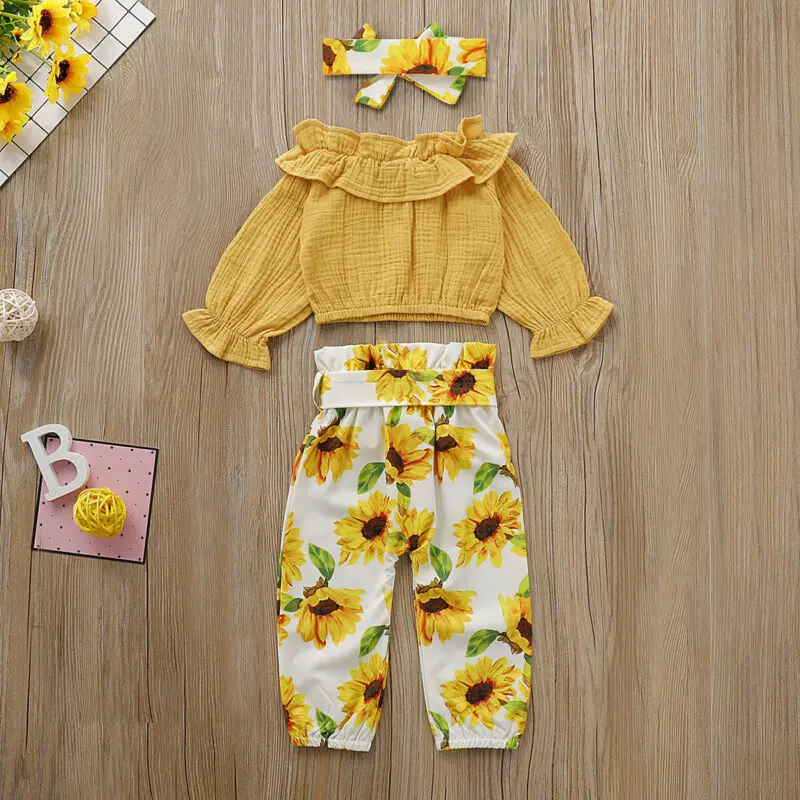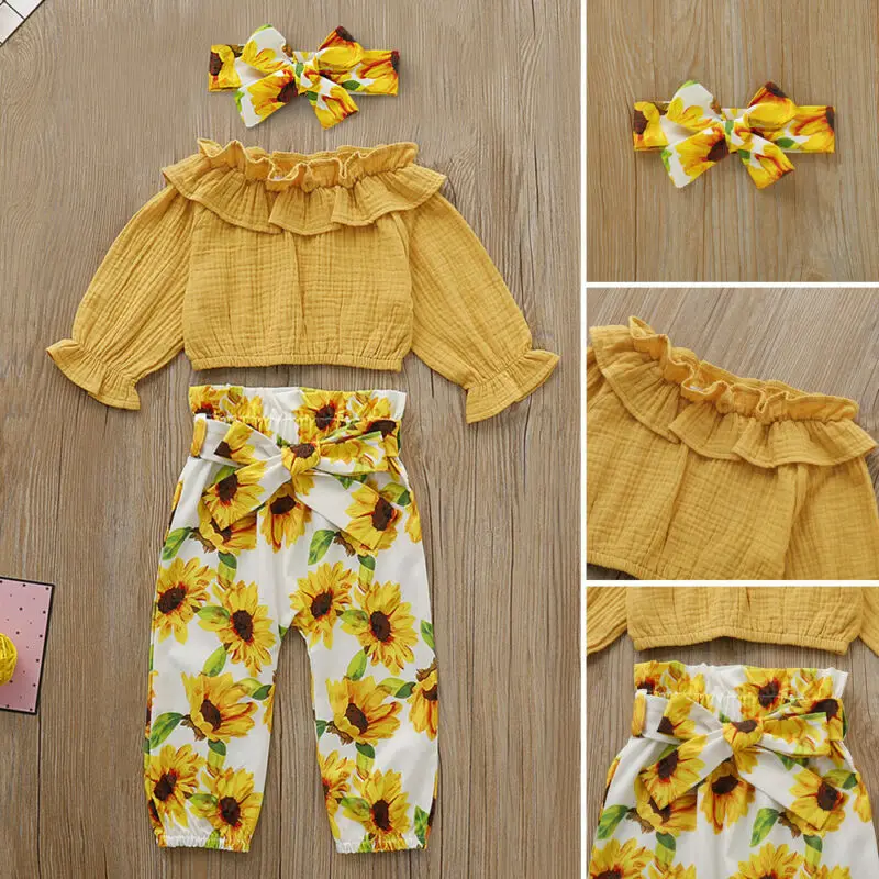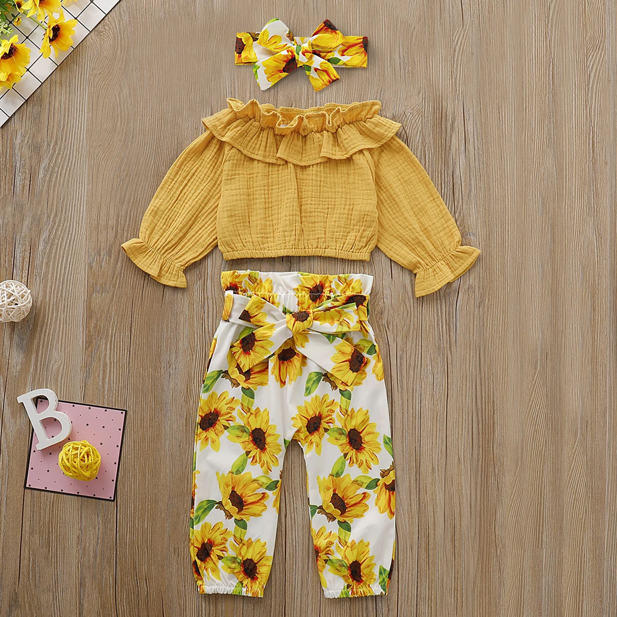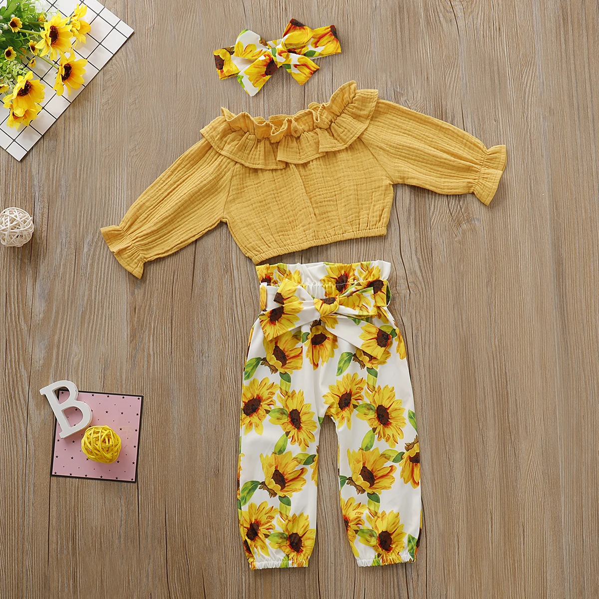 Детская одежда с цветочным принтом для маленьких девочек, футболка с длинными рукавами для маленьких девочек, топы + брюки + повязка на голову, комплект одежды из 3 предметов, летняя одежда для маленьких девочек, одежда для детей, одежда для детей, одежда для малышей, одежда для детей, одежда для д