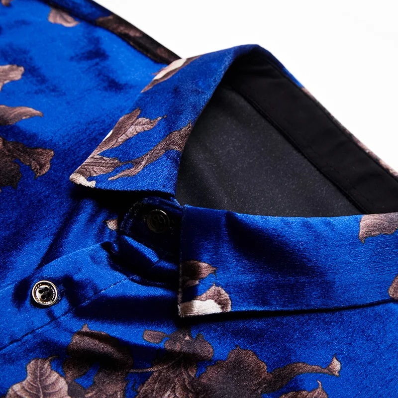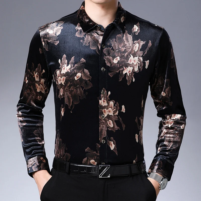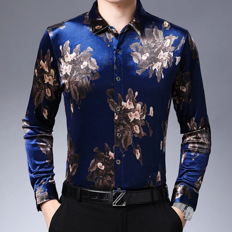 Новое поступление, Мужская бархатная рубашка, шелковое платье, рубашка, модная мужская бархатная одежда с цветочным принтом и длинными рукавами
