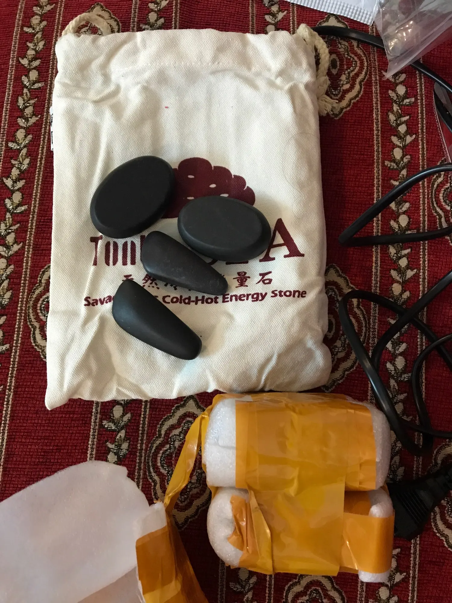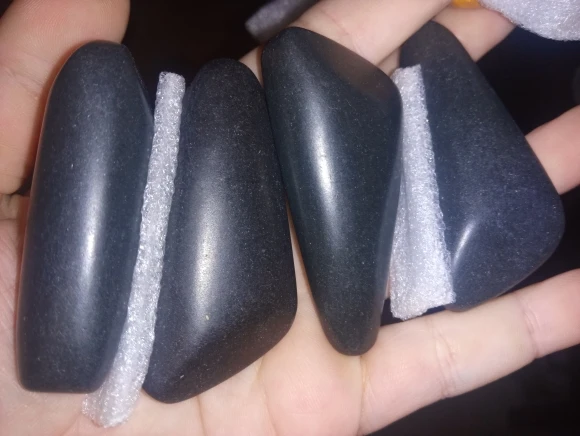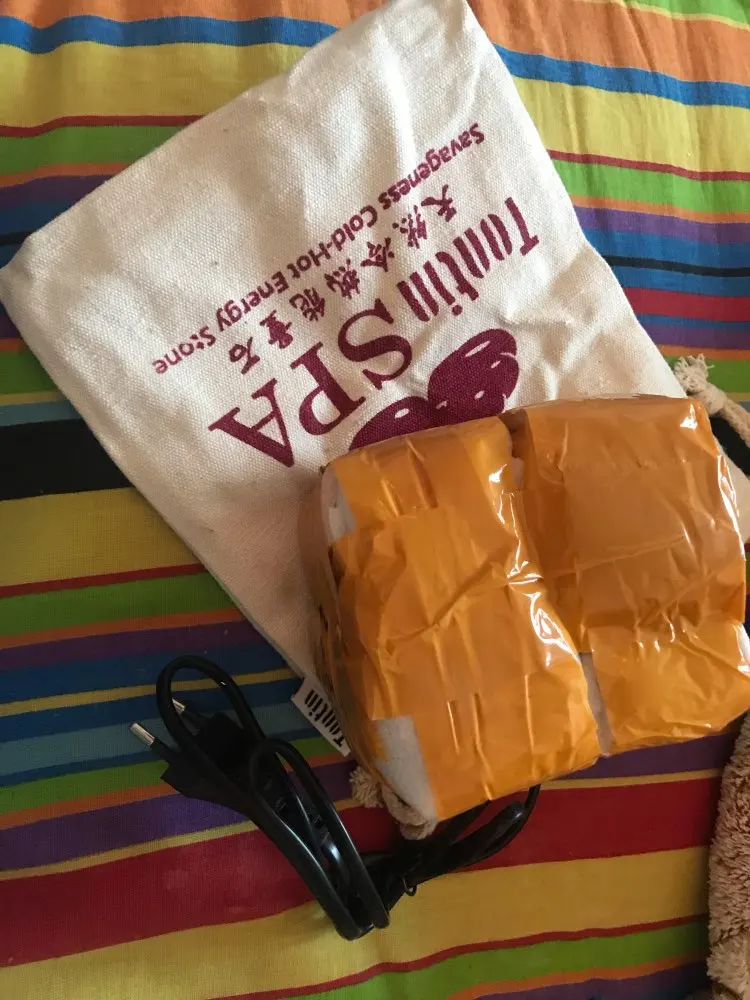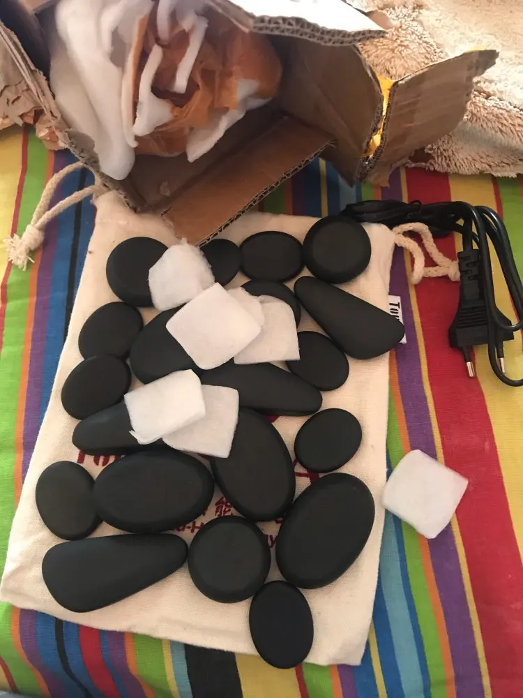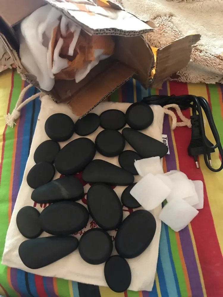 Заказ пришел через 30 дней после оформления. Камни были запечатаны в плотной картонной коробке. Каждый камушек упакован в отдельности. Мешочек подогрева не проверяла. Камушки мелковаты будут для массажистов с широкими руками. Для моих маленьких рук очень даже хорошо. Довольна заказом, рекомендую продавца.