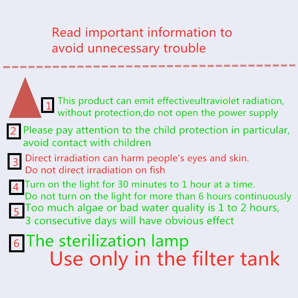 Примечание:1. Стерилизатор должен быть помещен в бак фильтра, не может положить его непосредственно в аквариум.2. Продукт предназначен для погружения.3. В процессе использования, пожалуйста, отключите источник питания и немедленно прекратите использование, если лампа входит в воду.4. Ультрафиолетовое излучение нанесет прямой вред коже и глазам человека, пожалуйста, не подвергайте воздействию.Рекомендации по использованию:Пожалуйста, выберите подходящая лампа в соответствии с размером вашего аквариума и фильтра.3-4 раза в неделю, не используйте его более 2 часов в день; Пожалуйста, в соответствии с реальной ситуацией.