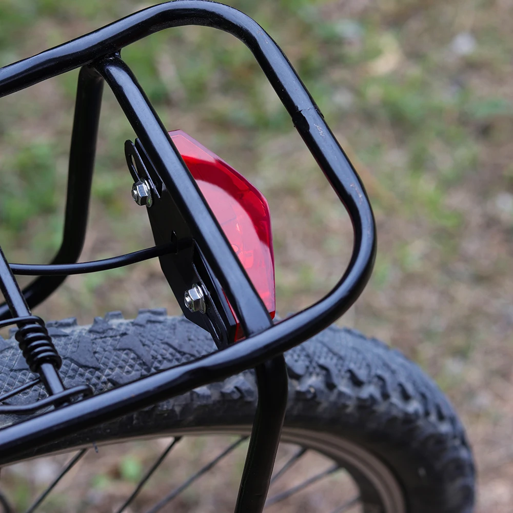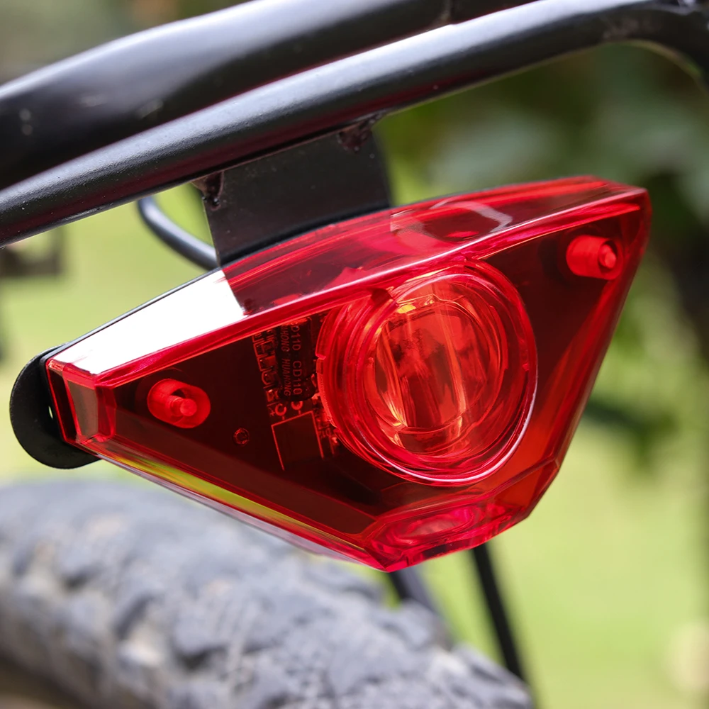 Большой угол луча 180 градусов, в разных направлениях можно увидеть задний фонарь электрического велосипеда.