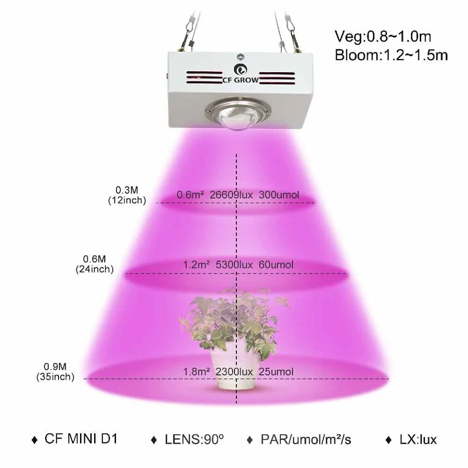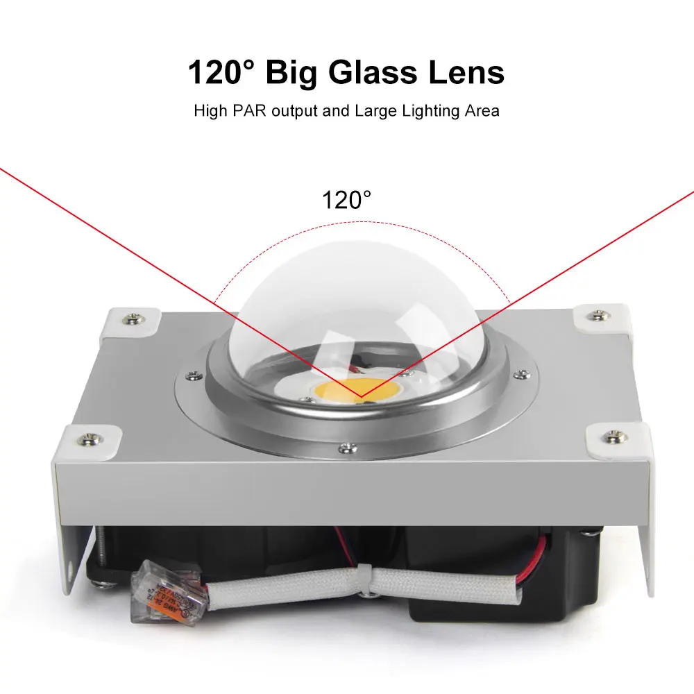 2. 120 градусов Большой стеклянный объектив, высокий светильник из-муфта эффективность и доходят в 97% светильник с высоким коэффициентом пропускания. Он может поставить высокий PAR выход 1028 мкмоль/м2/с, а также большую площадь освещения около 1 m2at 20 см (8 дюймов) высота.