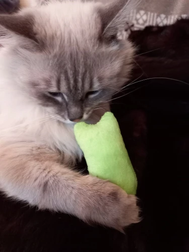 Моей киске понравилась игрушка. Внутри при нажатии хрустит, как фантик от конфеты, а это киса любит.
