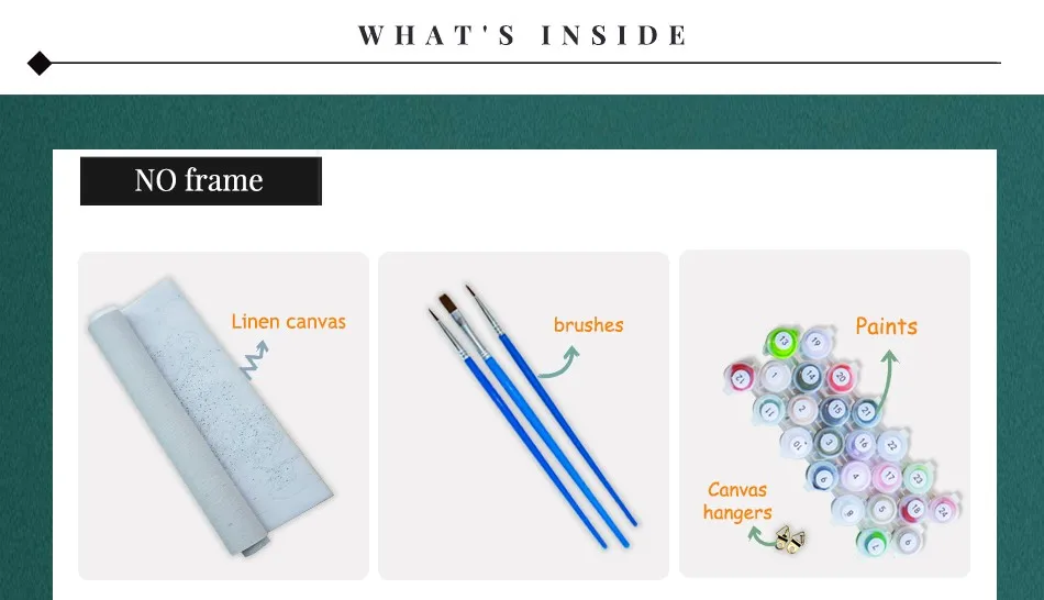 Нет рамки краски по номерам включают:1 * льняной холст, 1 набор акриловой краски, 3 * нейлоновые кисти, вешалки, pdf справки, руководство по цвету, посылка: свернутый холст по пузырчатой сумке