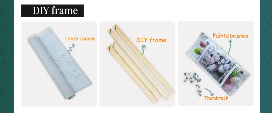 DIY рамка краска по номерам включает:1 Набор DIY frame,1 набор thumbtack, 1 * льняной холст, 1 набор акриловой краски, 3 * нейлоновые кисти, вешалки, pdf reference, руководство по цвету, посылка: свернутый холст с воздушным пузырьком