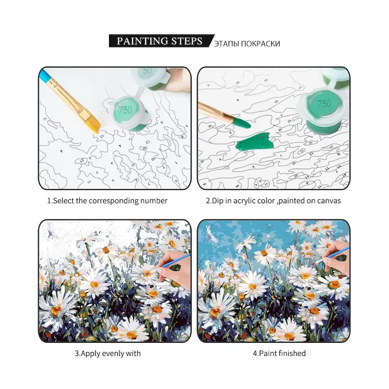 Готовая краска по номерам включает:1 Набор готовой рамы (льняной холст растягивается на раме) 1 набор акриловой краски, 3 * нейлоновые кисти, вешалки, pdf справки, руководство по цвету, посылка: коробка