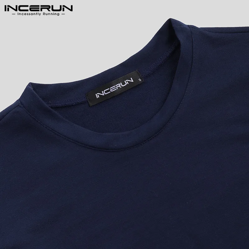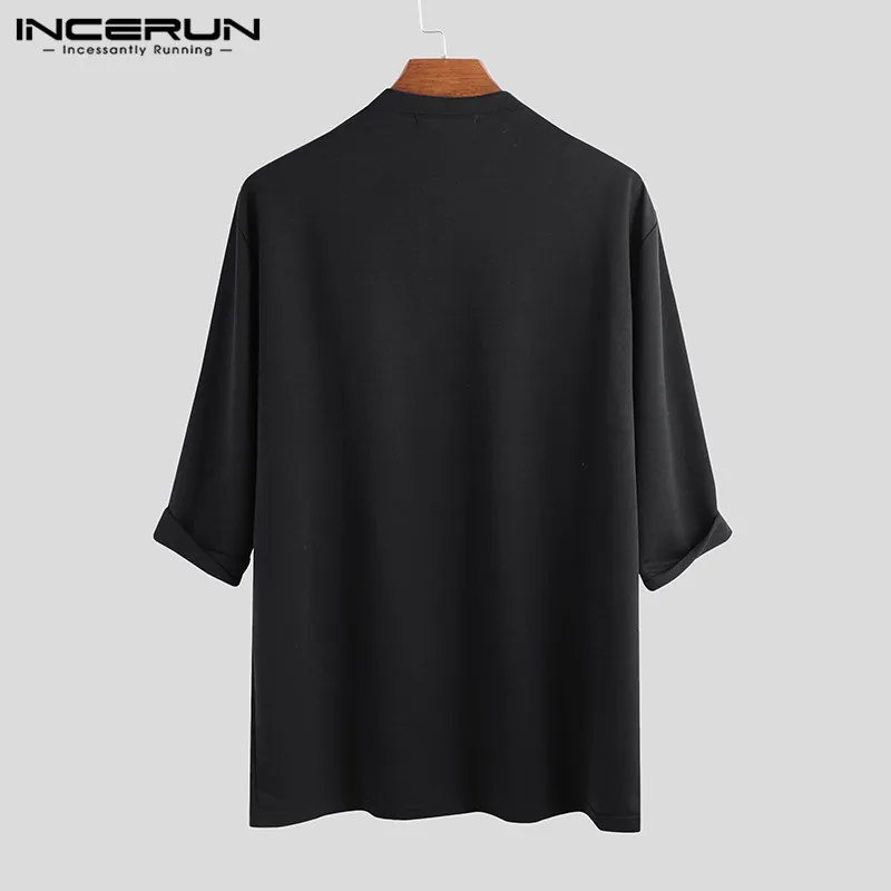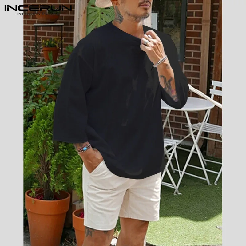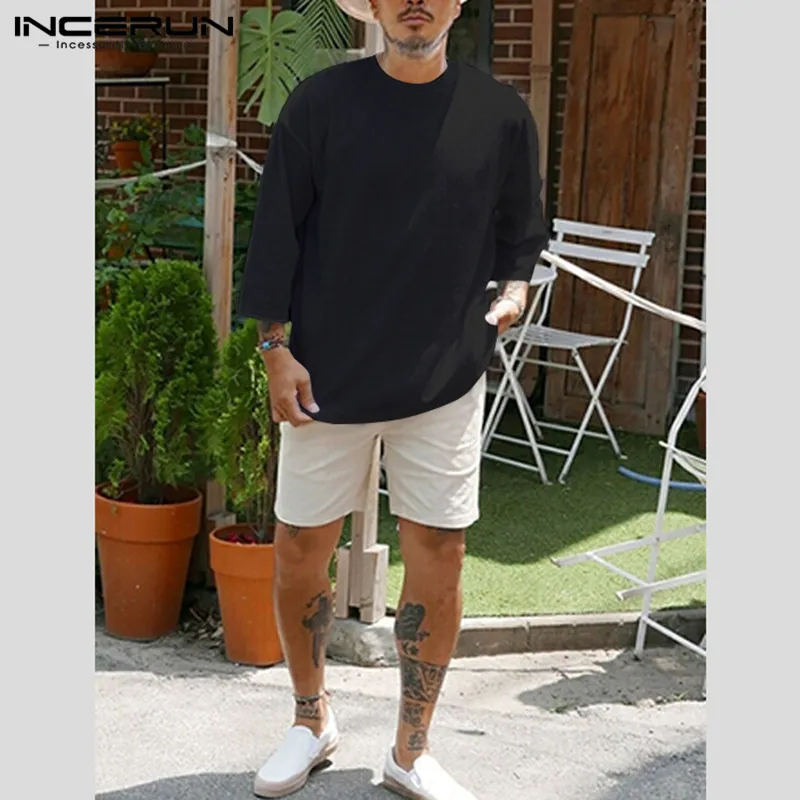 Футболка INCERUN мужская с круглым вырезом, модная повседневная рубашка из хлопка, с рукавом 34, мешковатая футболка, уличная одежда, размера плюс, 2021