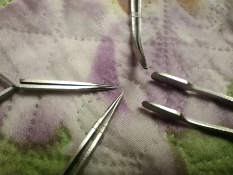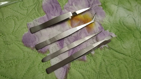 Довольно качественные пинцеты. Пока в работе не пробовал, но тонкие пленки цепляет хорошо, хват достаточный для таких размеров. Качество изготовления хорошее, острые края сточены. Чехол, в котором приходят пинцеты очень узкий, обратно запихнуть их практически не возможно.
