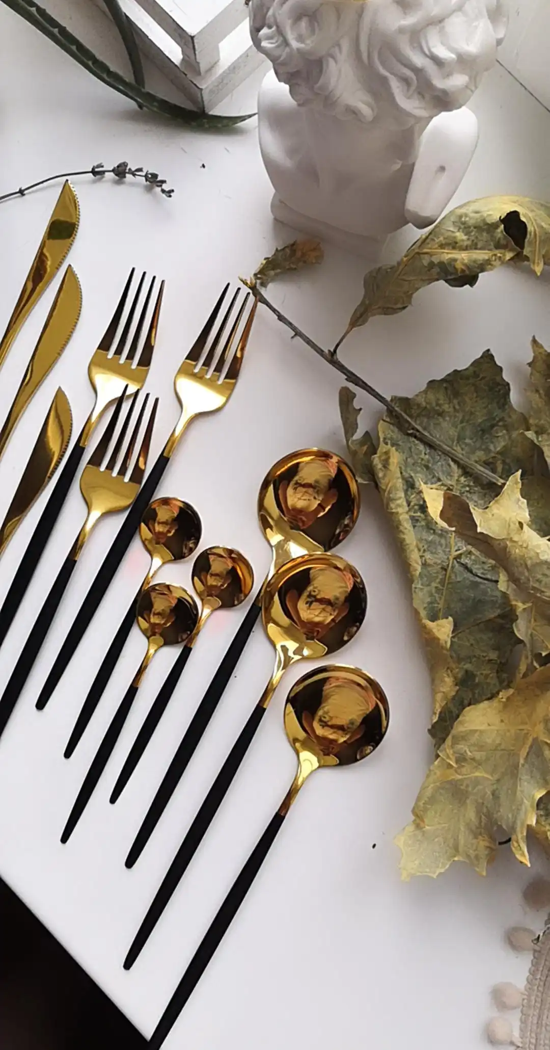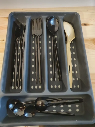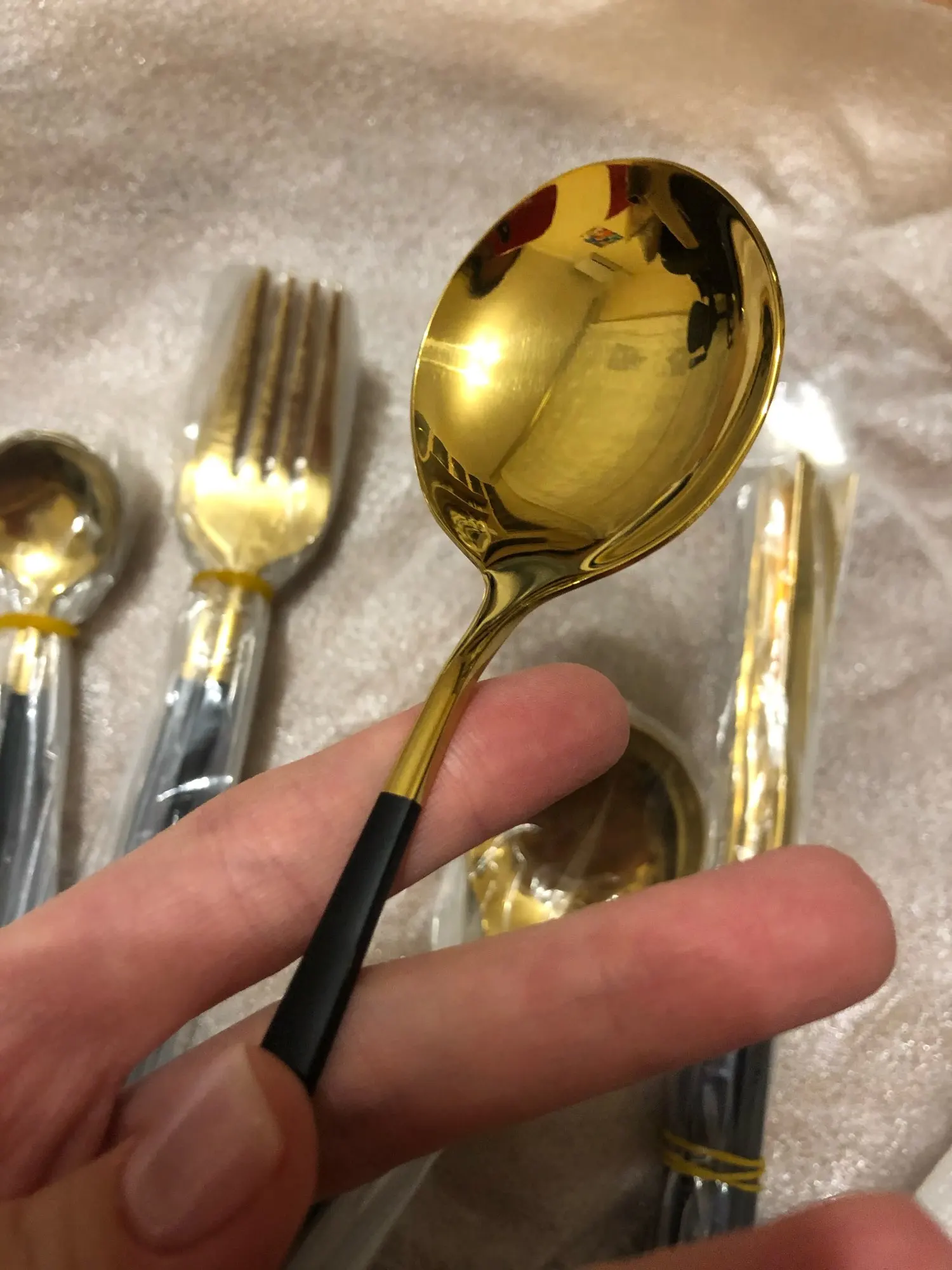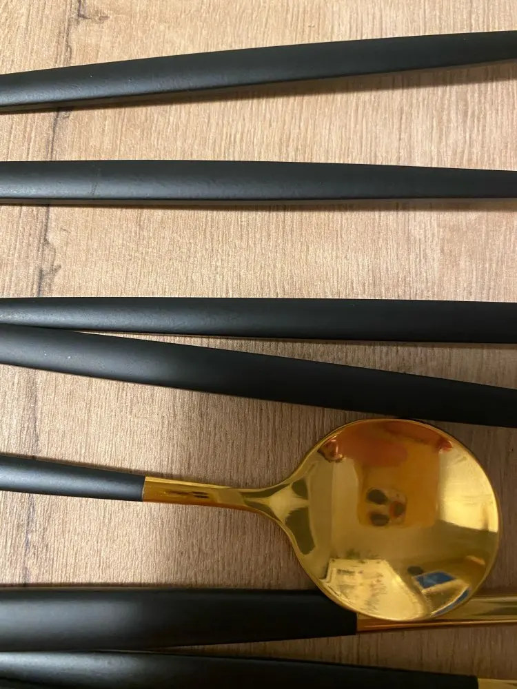 Обратите внимание что черная рукоятка матовая. но можно сочетать и с черным комплектом столовых приборов от этого продавца. Пришла посылка достаточно быстро. Ложка вкусная! Нож супер, режет под наклоном и придавливая (не пилит еду). Чайная ложка милая. Тонкая рукоятка и немного тяжело справляйся с большим куском еды, но со временем становится легче.