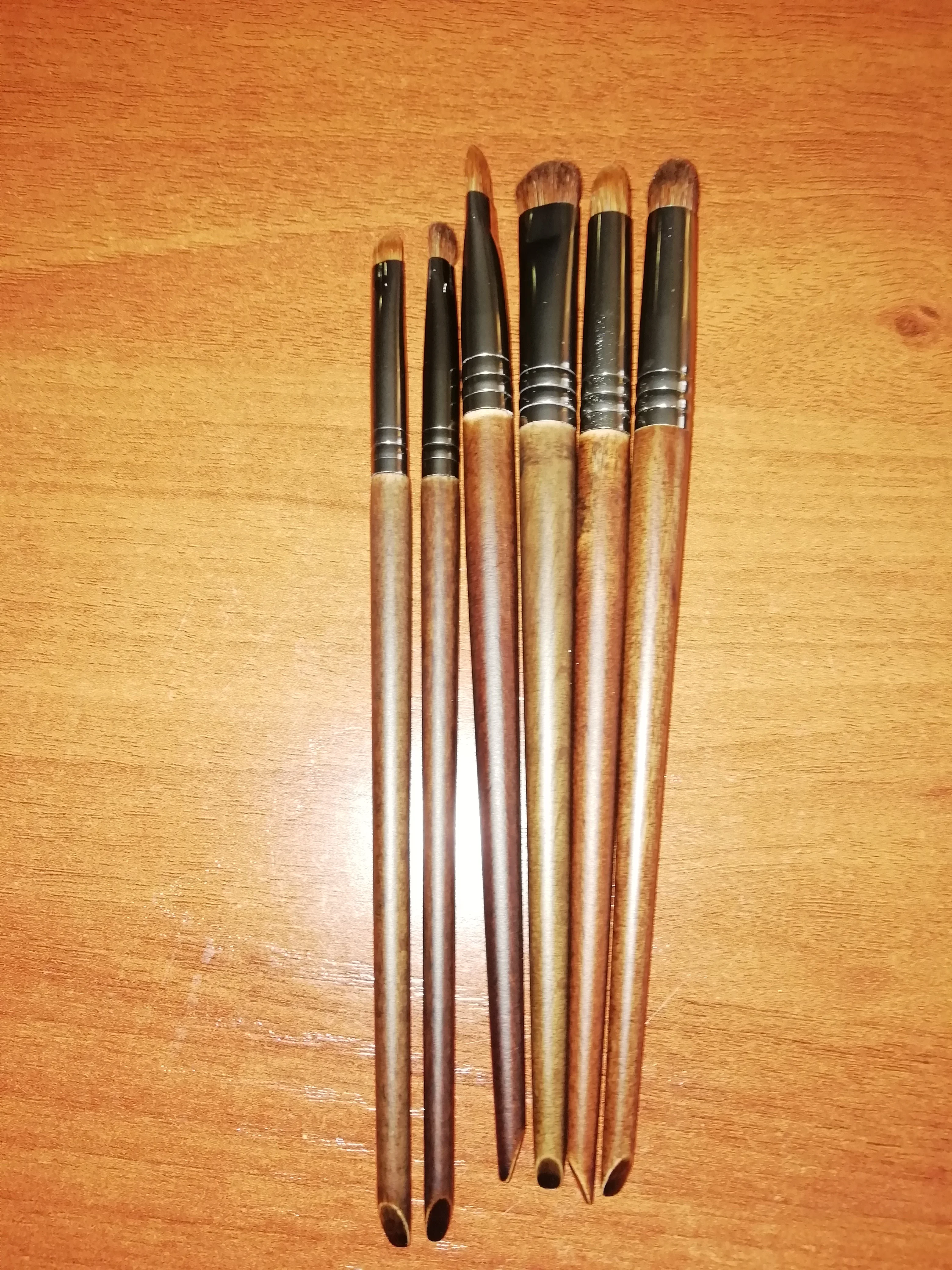 Хорошие, мягкие кисти, удобная ручка вроде из дерева. Выполнены аккуратно, смотрятся тоже «дорого», такие и подарить не стыдно. Доставка заняла примерно 4 недели. Единственное, пару кистей, все-таки, для растушёвки теней большеваты, но попробую в работе. В подарок продавец положил 2 кисточки для ресниц, спасибо большое!