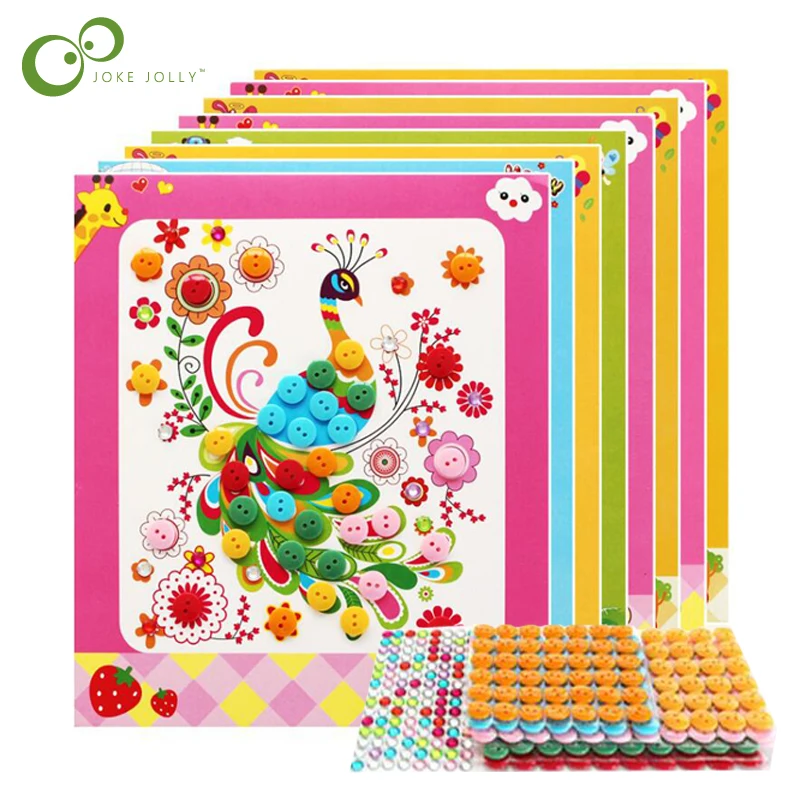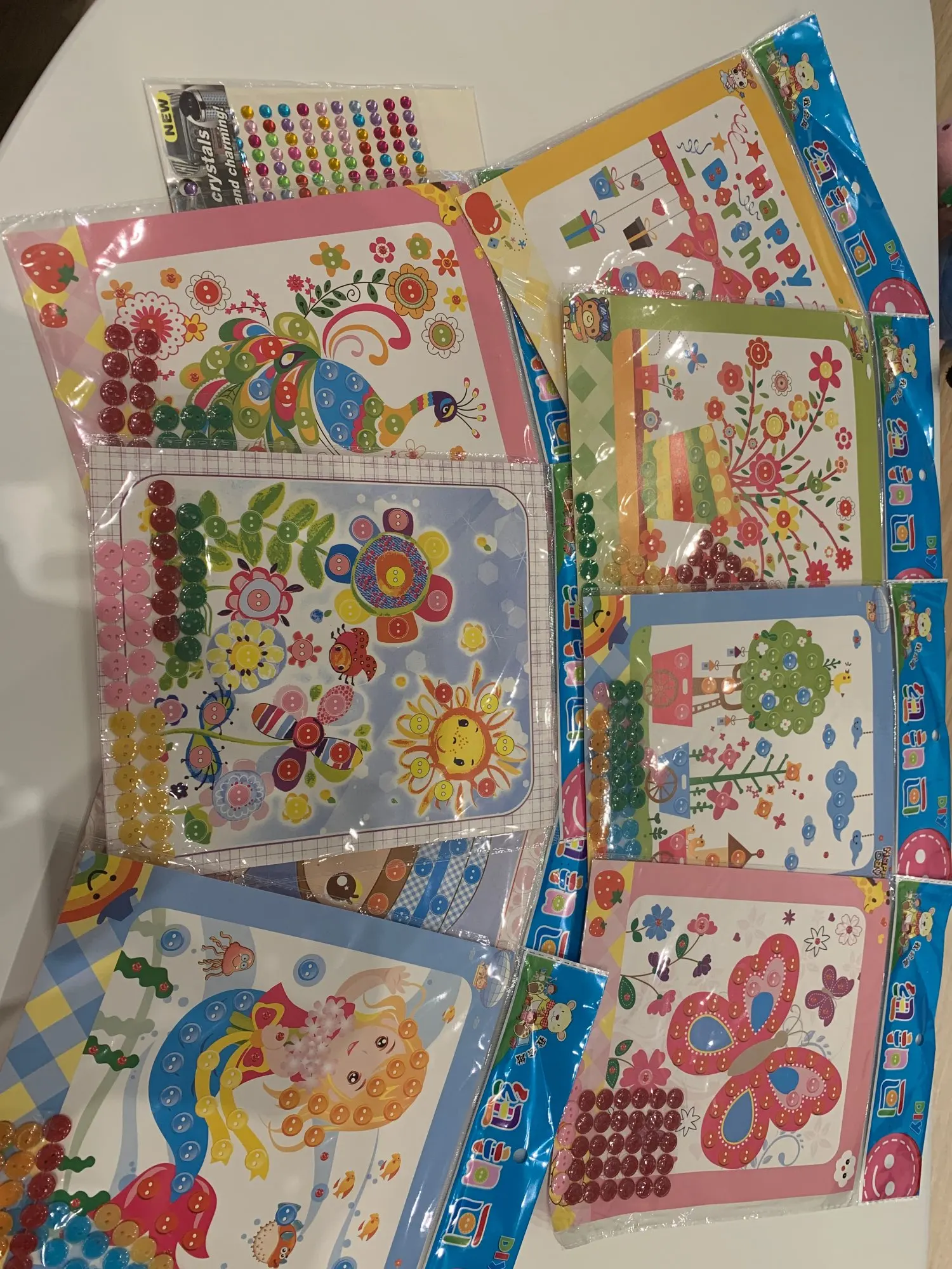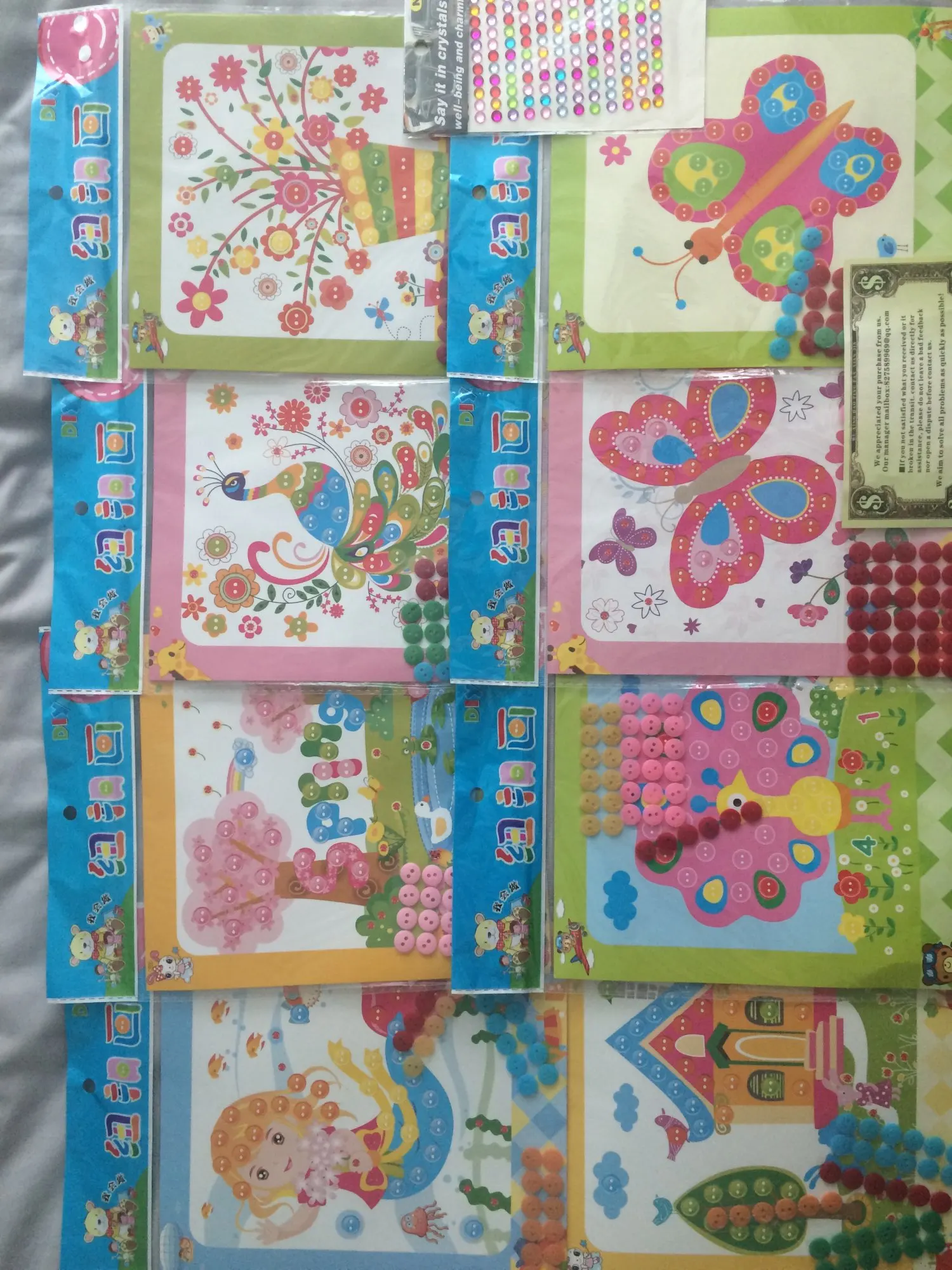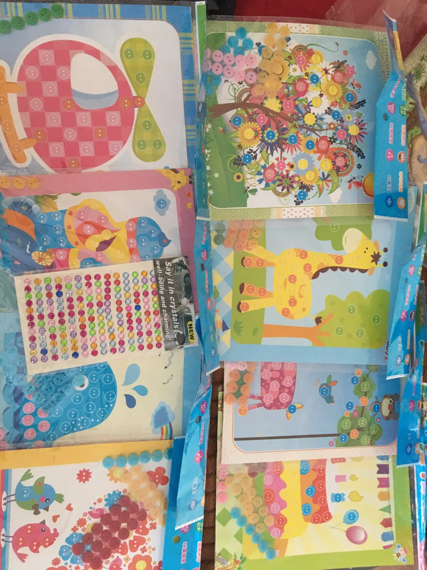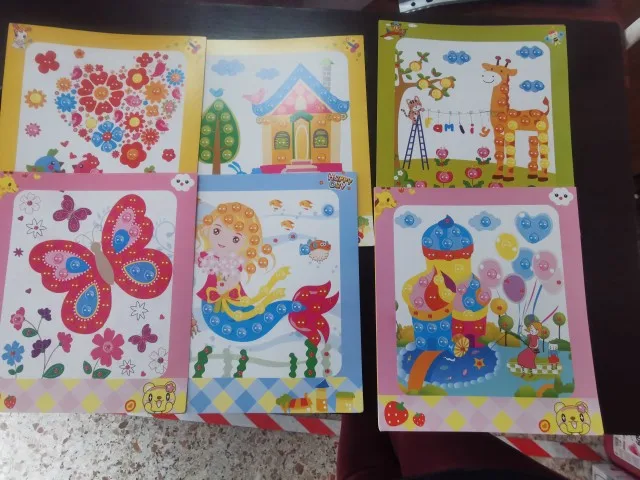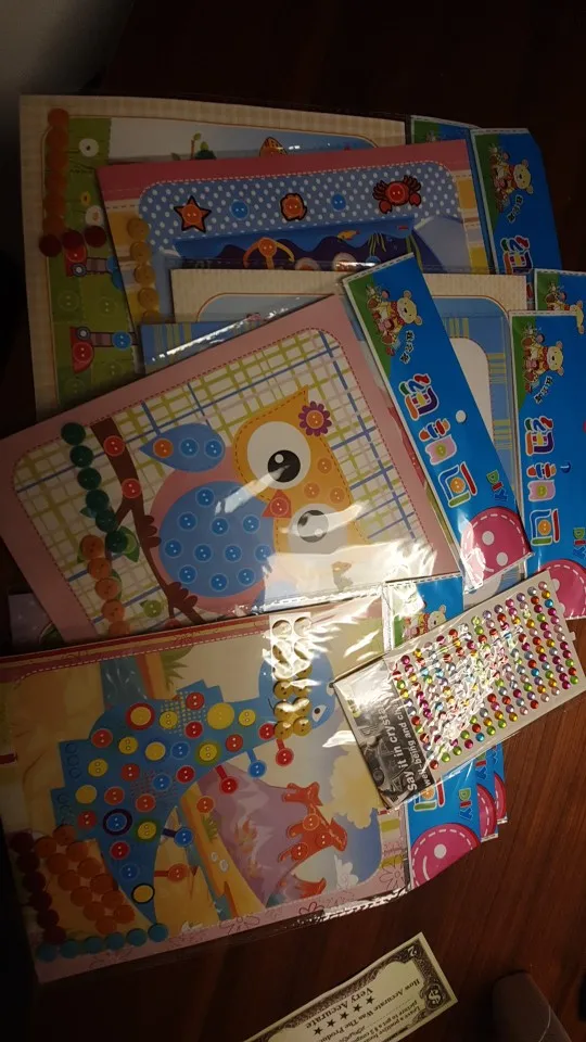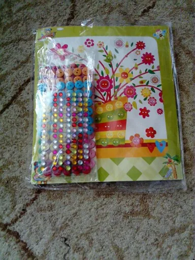 Товар отличный. Ребёнок очень доволен. 8 листов и к каждому наклейки - пуговки. Так же был набор страз. Клеится хорошо. Можно т как открытку поздравительную сделать, цвета закрепить, да и просто с ребёнком время провести. Мне нравится. Фото прилагаются.