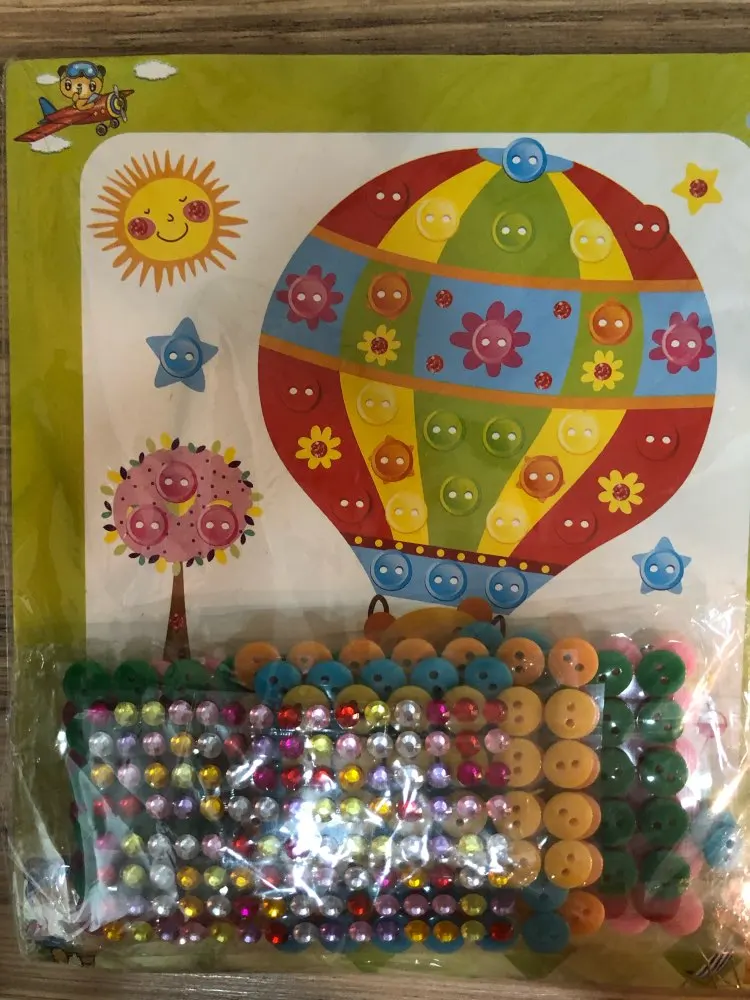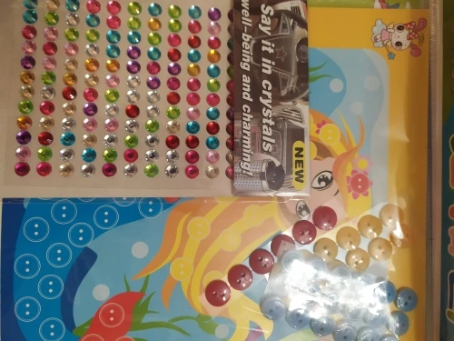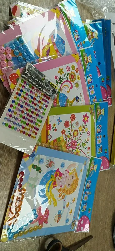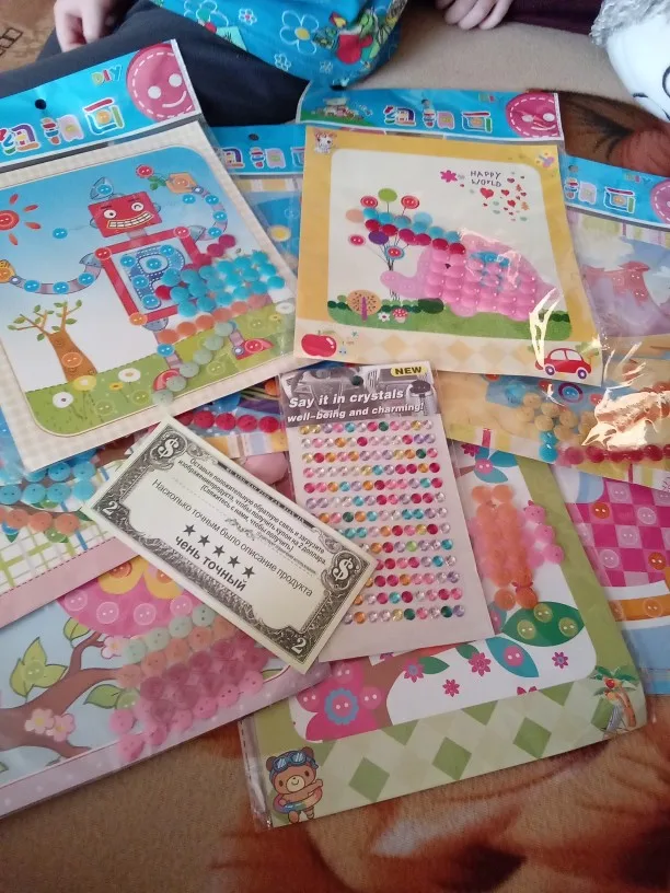 Посылка пришла быстро. Все как на фото. Пуговки 1 см в диаметре на клеевой основе. Фон яркий красивый 17*15 плюс рамочка. Картинки все разные. Стразы 0,5 см на прозрачной клеевой основе. Интересное занятие для детей, развивает мелкую моторику. Рекомендую товар и продавца. В подарок положили купон-спасибо. Буду заказывать еще, продавец надежный.