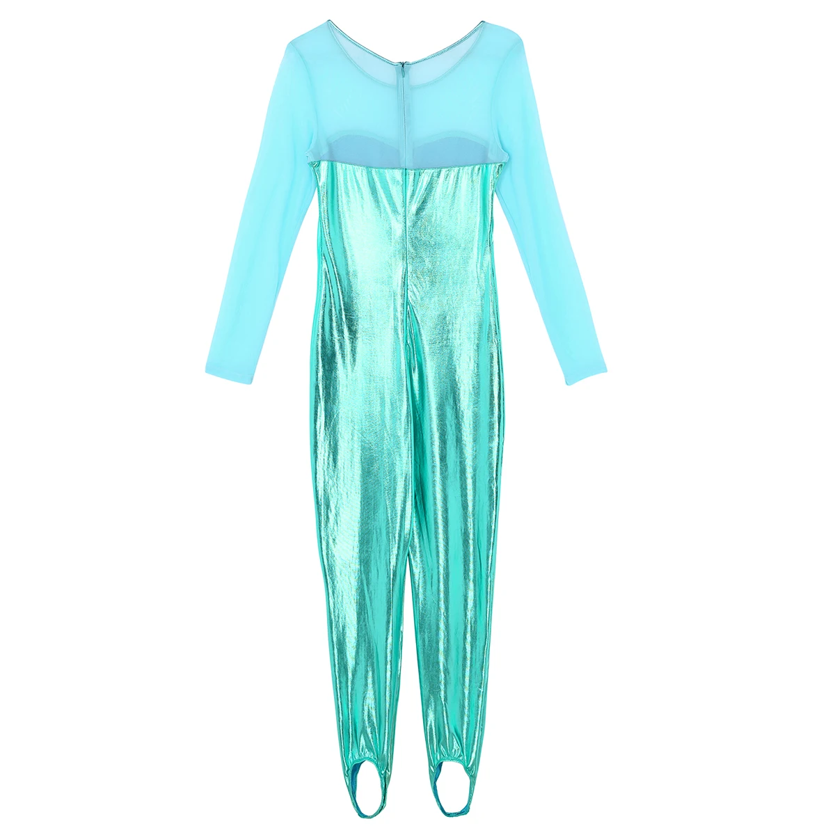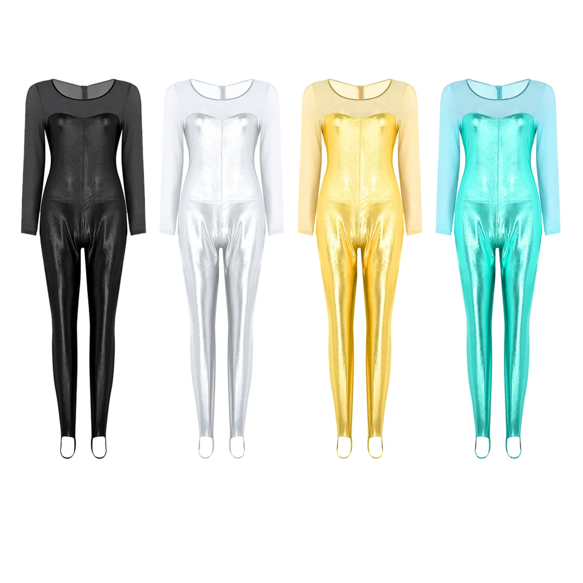 Женский балетный купальник, цельный Блестящий металлический костюм с круглым вырезом и длинным рукавом, современный боди со штрипками, танцевальный костюм, гимнастическое, балетное трико