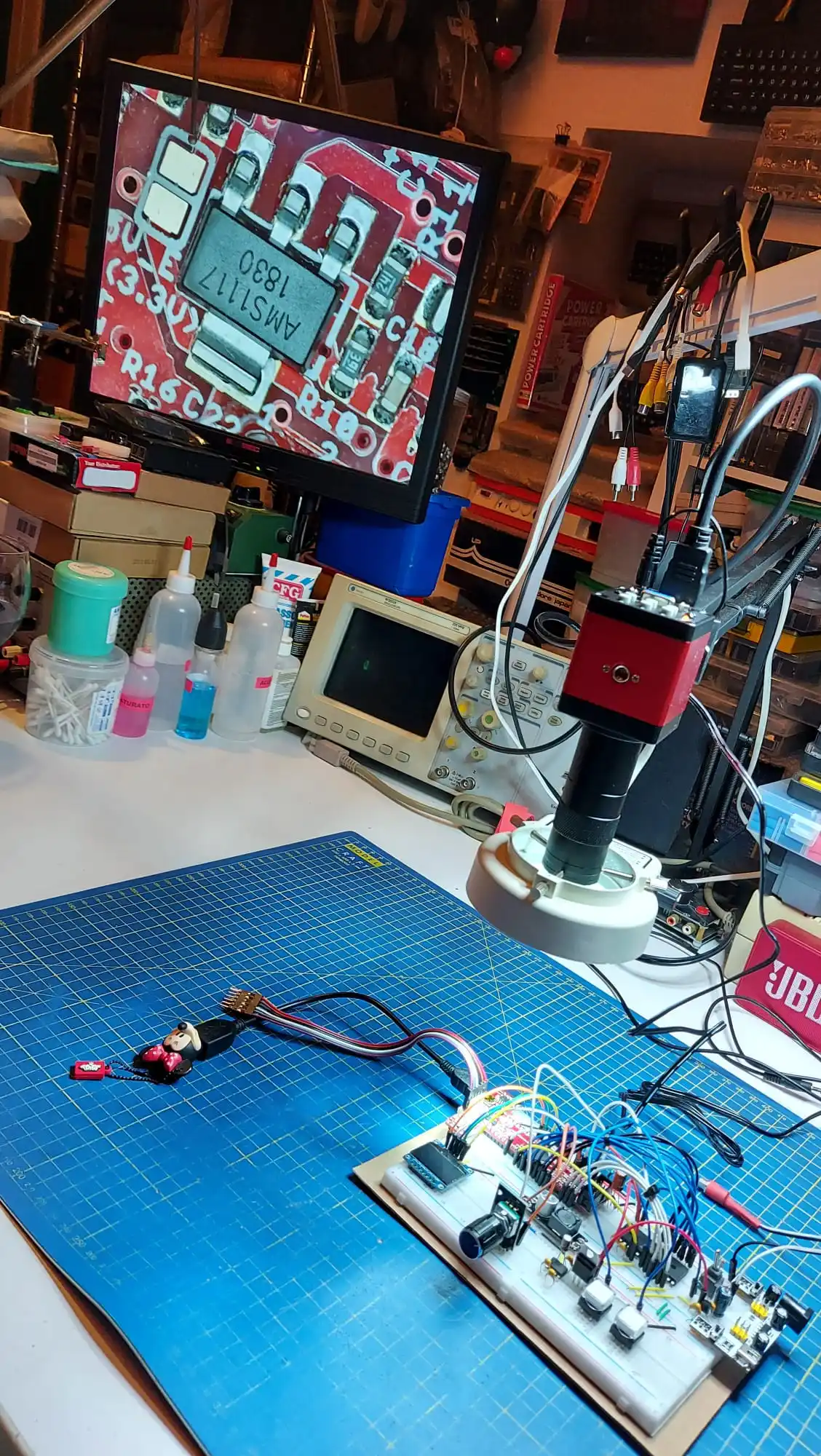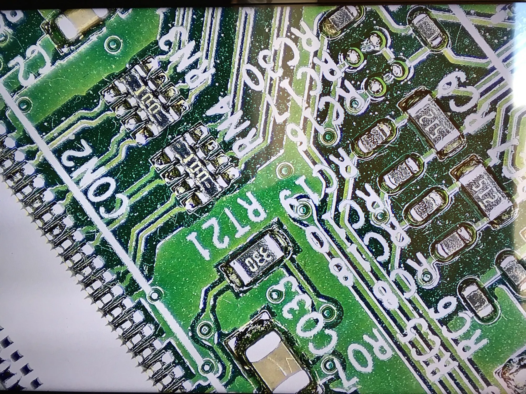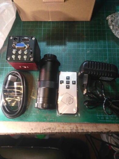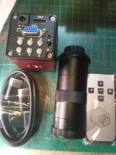 Покупал только камеру. Объектив использовал свой - Computar MHL-10x, подсветка кольцевая самодельная (8 трёх ваттных светодиодов). Результаты на фото (используется выход VGA). Задержки практически нет - паять можно. Возможно есть проблемы с цветопередачей (плата с фото на самом деле тоже зелёная)), но сравнить не с чем. Для ремонтных работ это не критично.