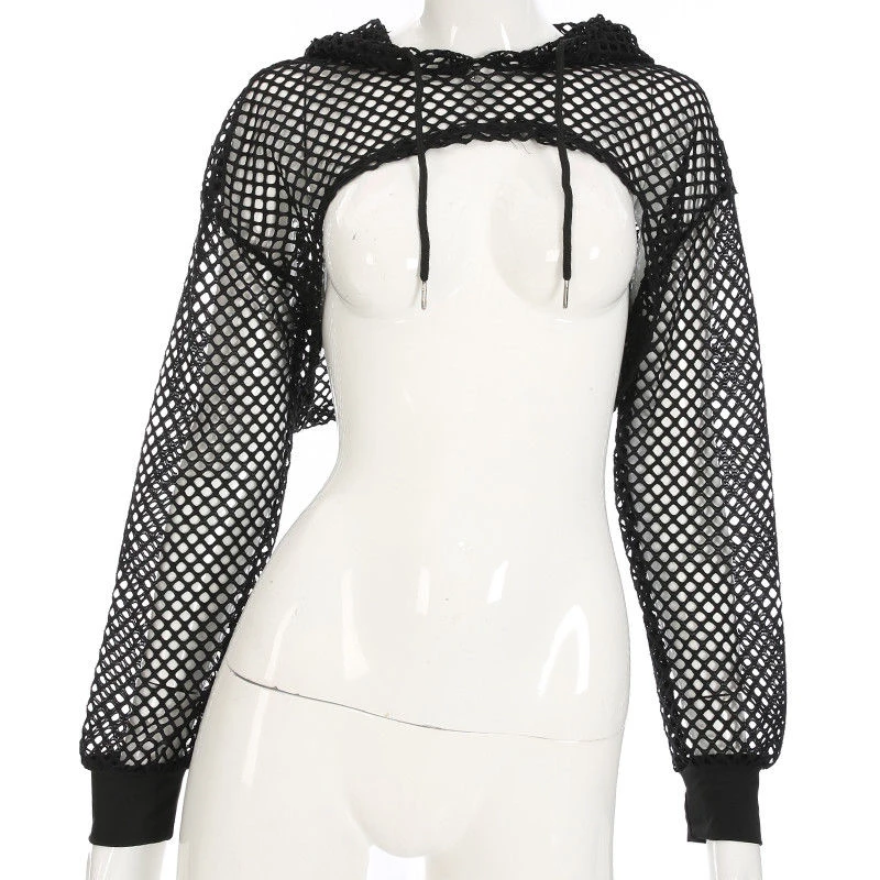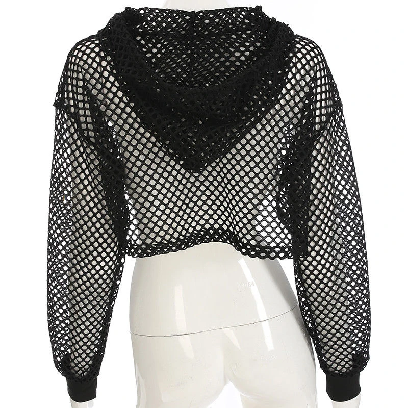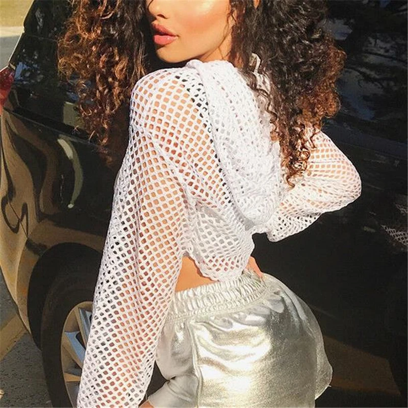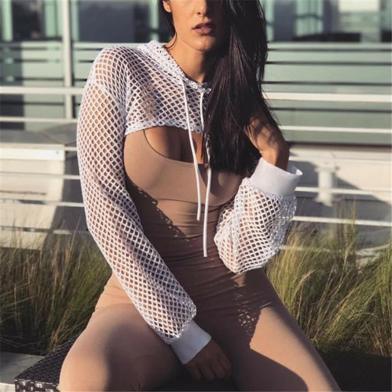 Кроп-топ женский прозрачный сетчатый, пикантная сетчатая майка с защитой от солнца, облегающая футболка с капюшоном, уличная одежда