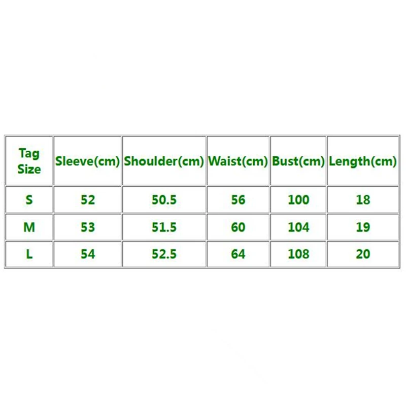 Тег Размеры Рукава(См) Сумка на плечо(См) Обхват талии(См) Обхват груди (см) Длина (см) S 52 50,5 56 100 18 М 53 51,5 60 104 19 L 54 52,5 64 ГБ 108 20Разница в 2-3% в соответствии с измерениями вручную. Прежде чем купить эту товарную позицию, просим тщательно свериться с таблицей размеров.