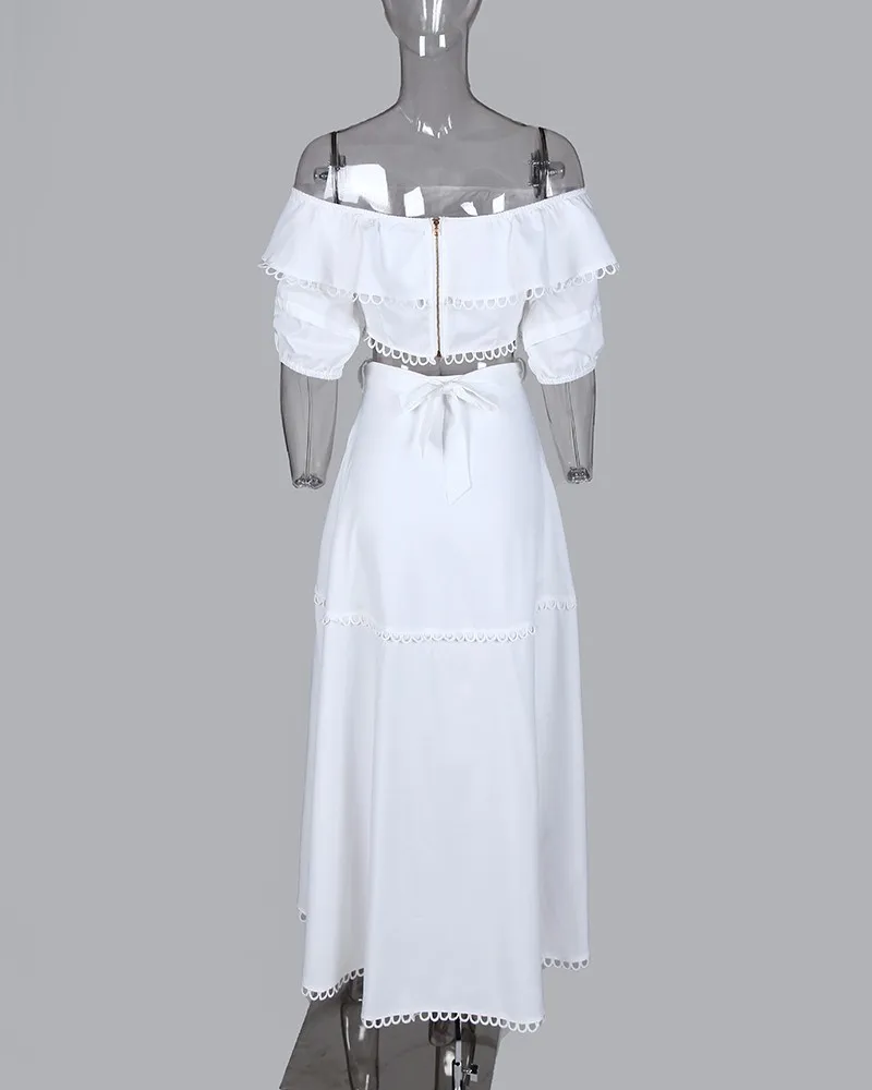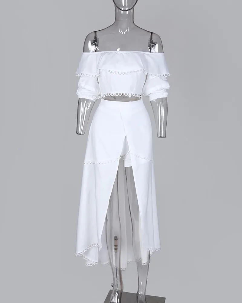 Женский топ с открытыми плечами и длинная юбка с разрезом, однотонный повседневный комплект из 2 предметов