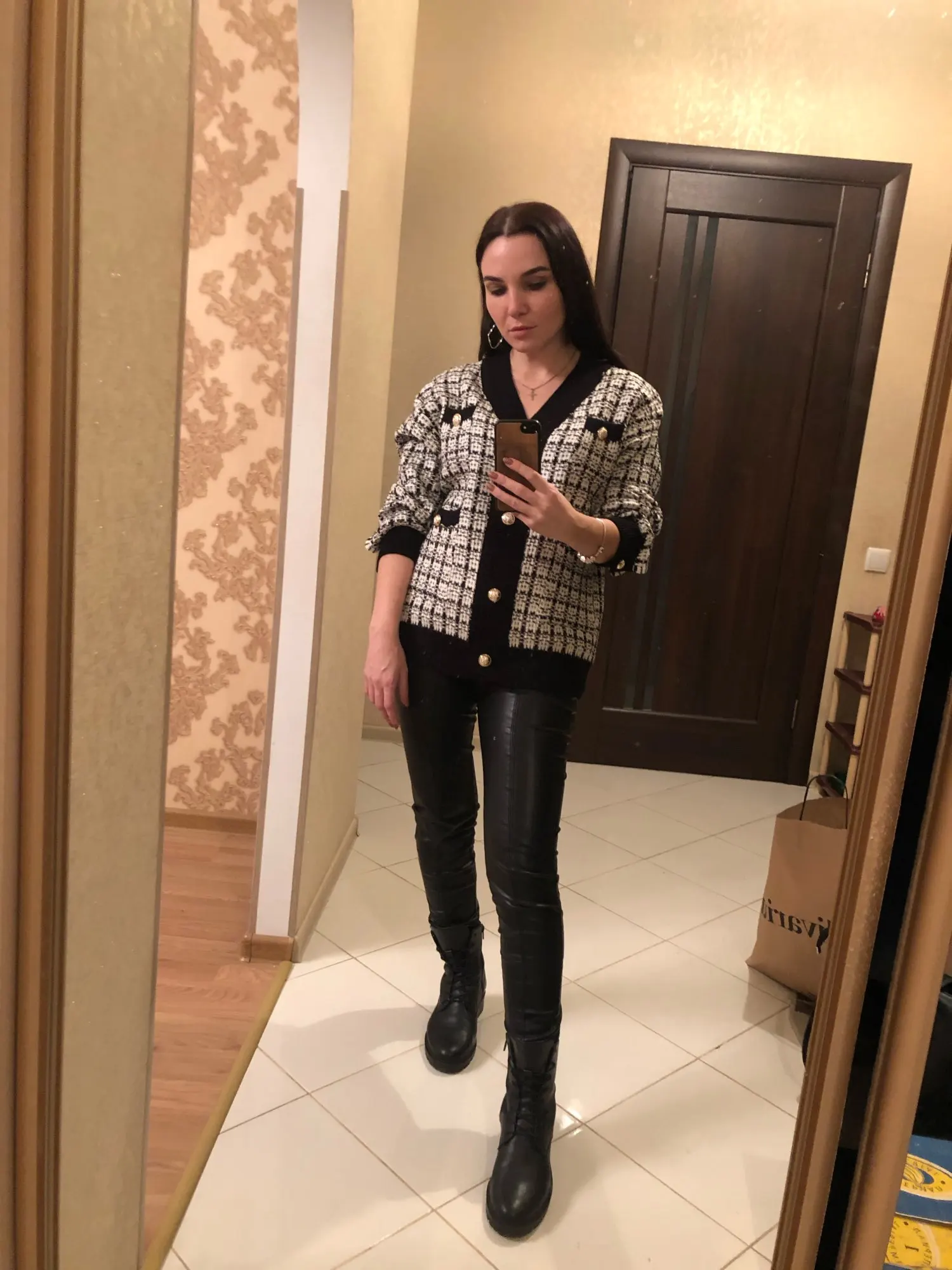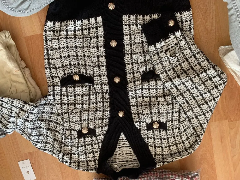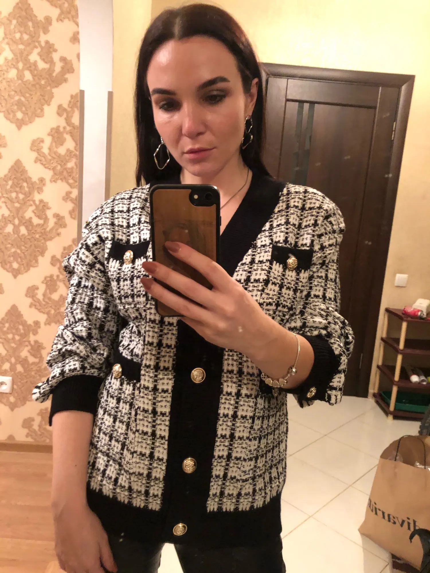 Очень красивый кардиган! Хорошее качество, выглядит точно так же, как на фотографии, но кнопки серебристые, а не золотые. В 165 см и 75 кг это как обычный кардиган, не большой размер: D не сюрприз