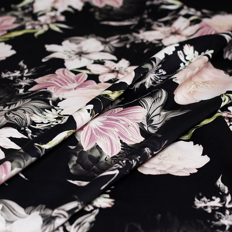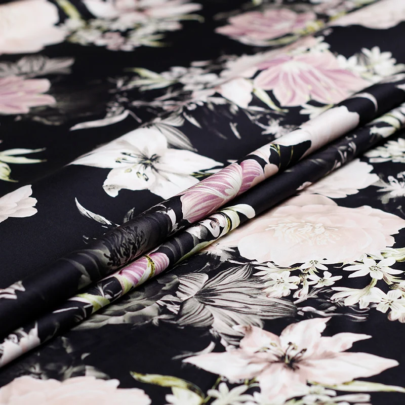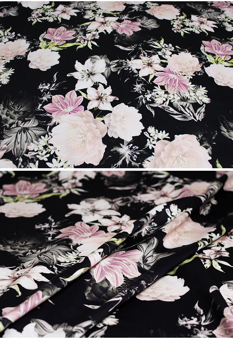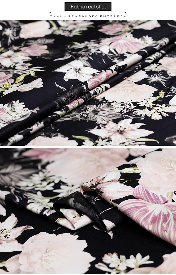 Pearlsilk черного цвета с узором цветы; цифровые печатные эластичный атлас дрель ткани материалы для одежды осеннее платье Шитье Ткань Fresshipping