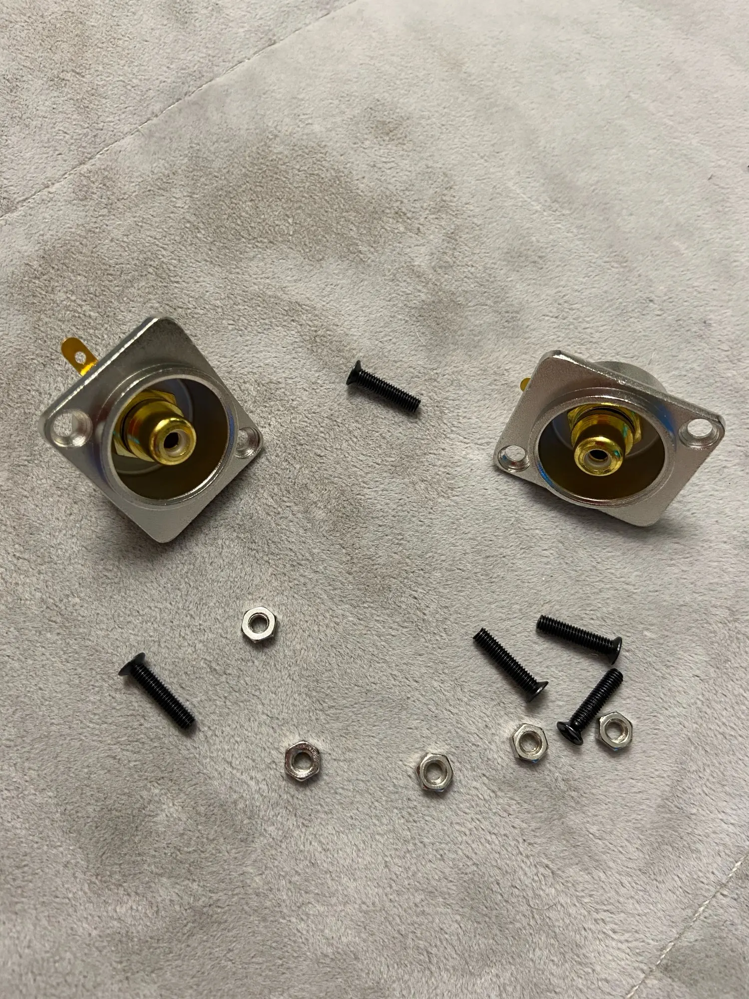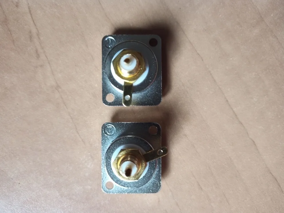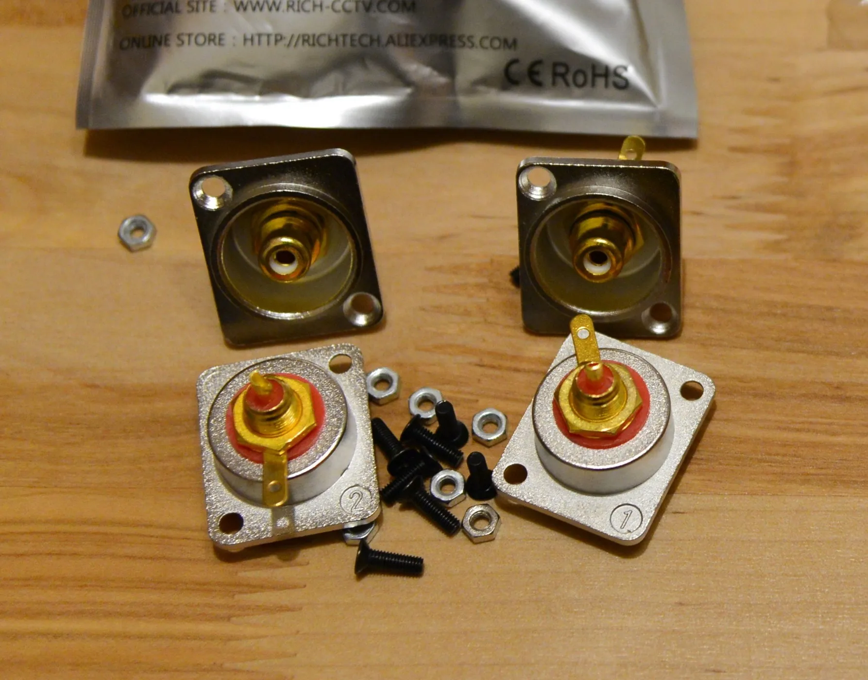 Упакованы парами в фирменные пакетики. Пришли примерно недели за три. Качество материалов и изготовления очень хорошее. В комплекте также крепёжные винты с гайками. Если нужно, на фланцы можно установить RCA гнёзда более высокого уровня. Рекомендую товар и продавца.