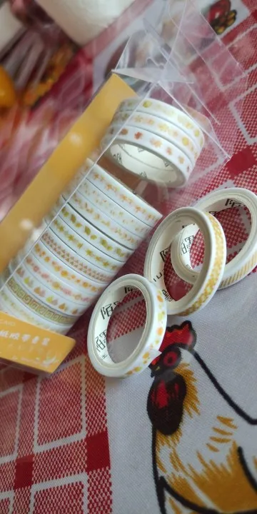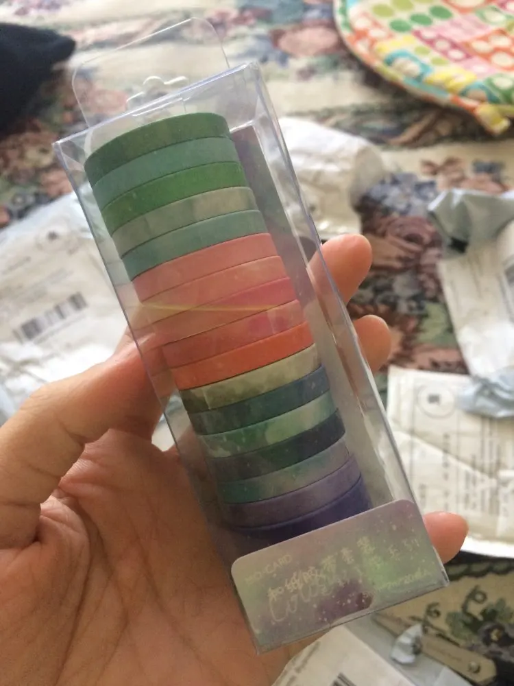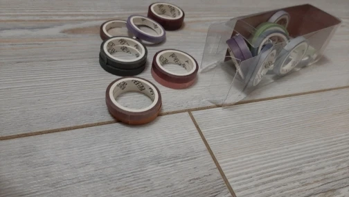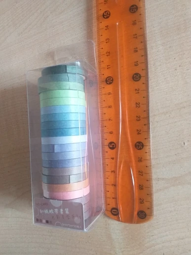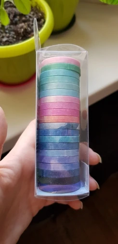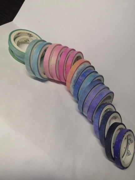 шикарные скотчи!искала осенне-зимний набор однотонных,этот то что надо!Скотчи маленькие,намотка нормальная, цвета супер,есть 2 одинаковых (салатовые),клеятся хорошо,скотчи матовые,на них можно писать шариковой ручкой.Старалась делать фото ближе к реальности чтобы были цвета,на последнем фото точная цветопередача.